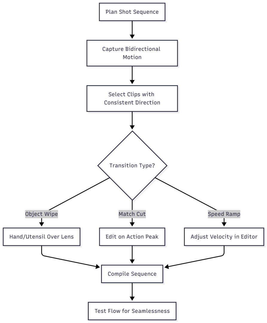 Begin with object transitions: pass a hand, utensil, or ingredient over the lens to wipe between scenes. For example, swipe a knife across the frame after chopping onions, cutting to the next ingredient seamlessly. Action match cuts build on this—edit on motion, like a downward knife slice matching a pouring stream. This technique, inspired by film editing, maintains energy.