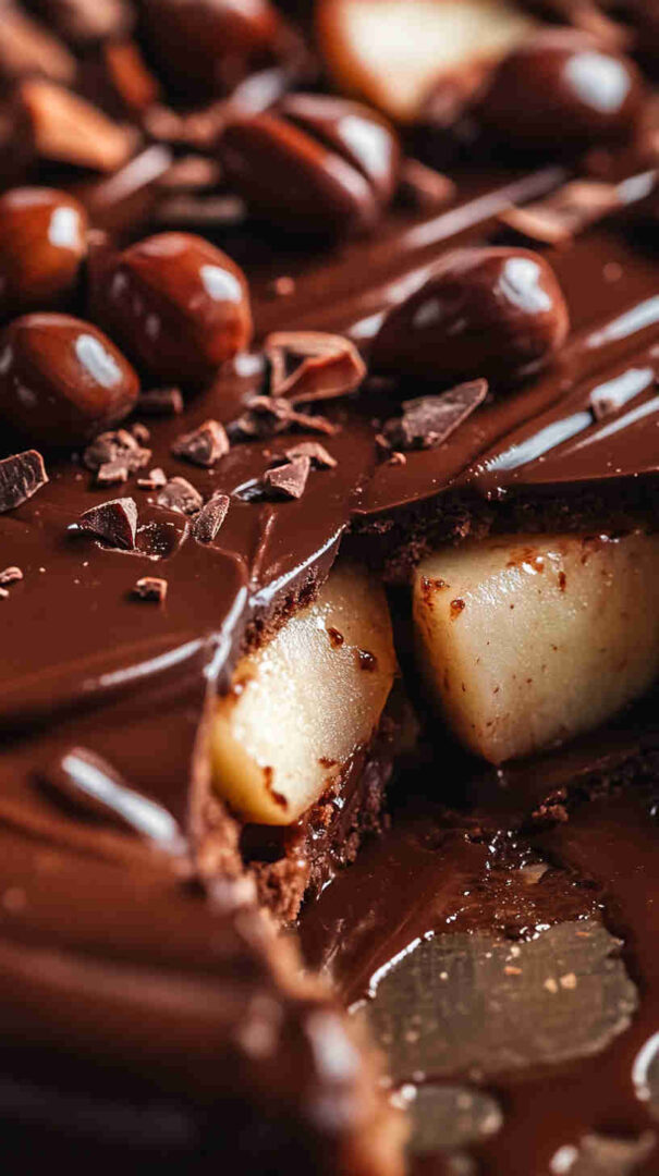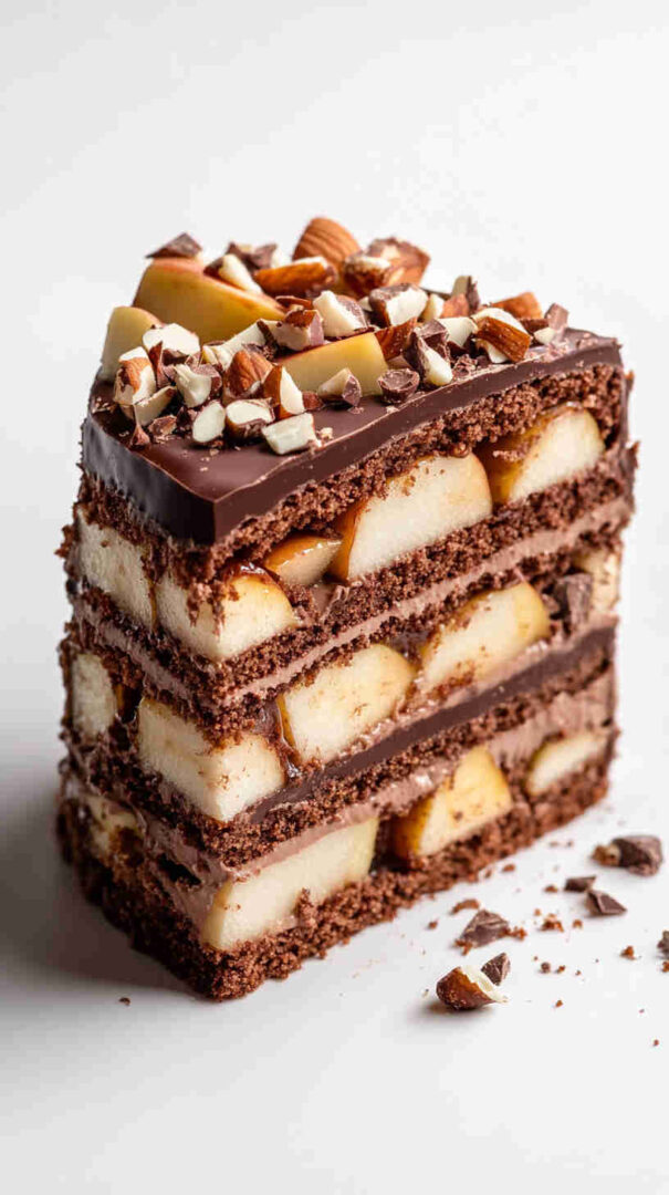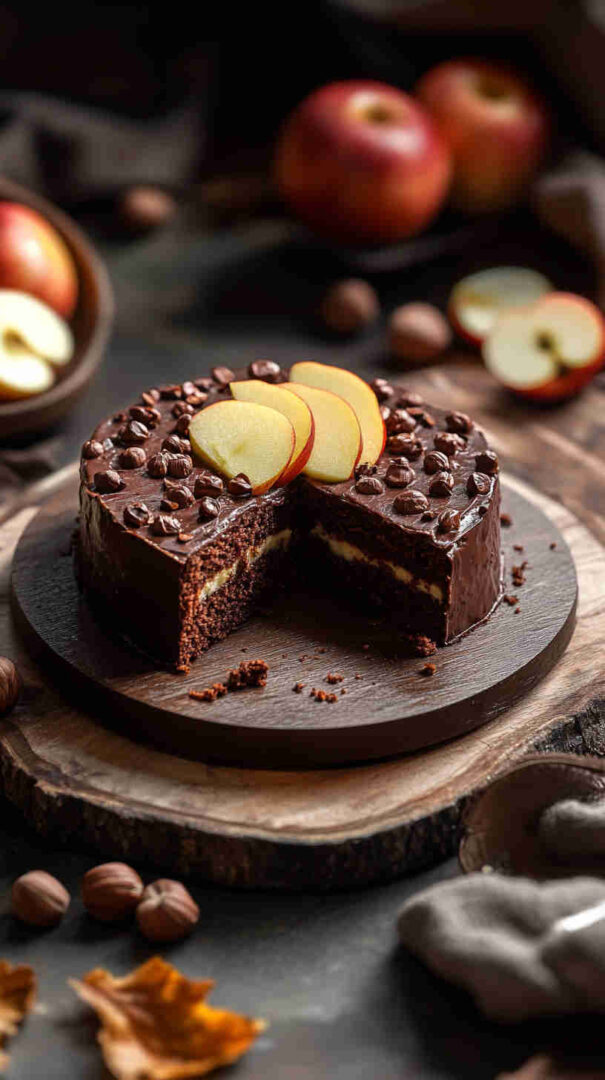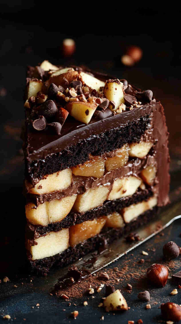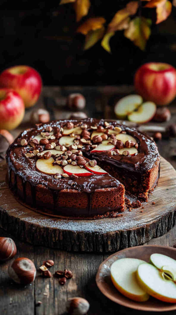 Moist chocolate cake with juicy apples, toasted hazelnuts, and rich ganache – nutty, fudgy fall perfection.