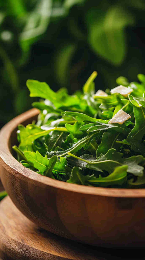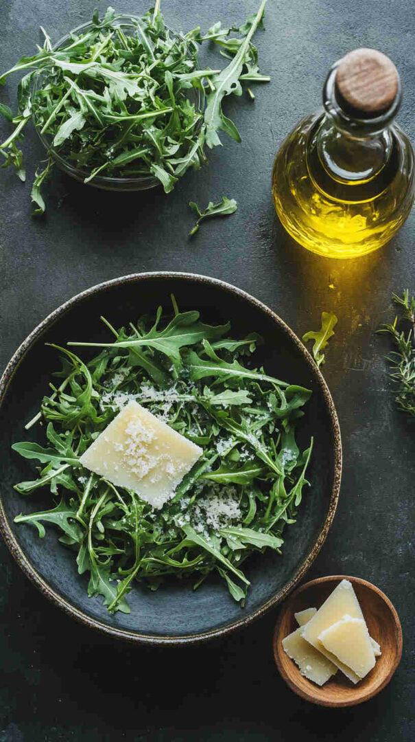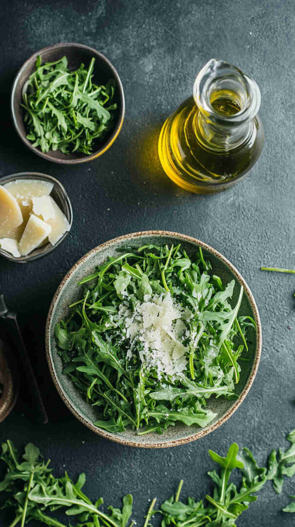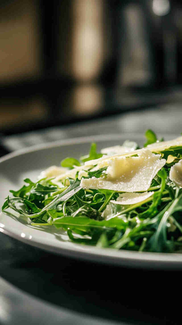 Best enjoyed fresh—dressed arugula wilts quickly. Store undressed components separately: keep arugula in a damp paper towel inside a sealed bag in the crisper (up to 3–4 days), store shaved cheese airtight in fridge (up to 1 week), and keep vinaigrette in a jar (up to 5 days—shake before using). Assemble just before serving. Do not freeze.