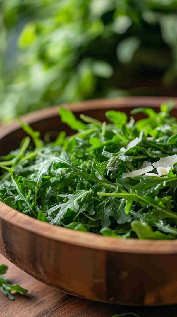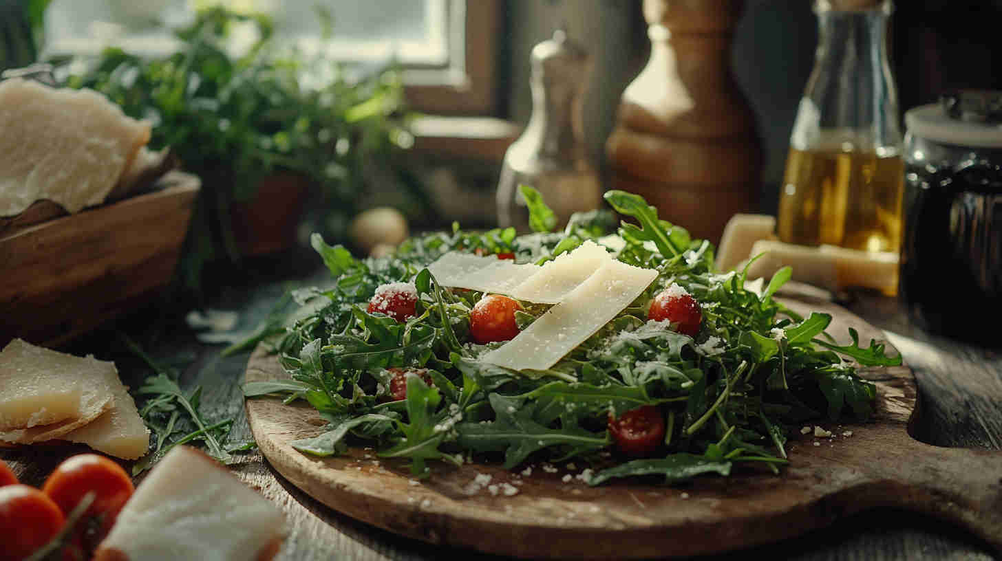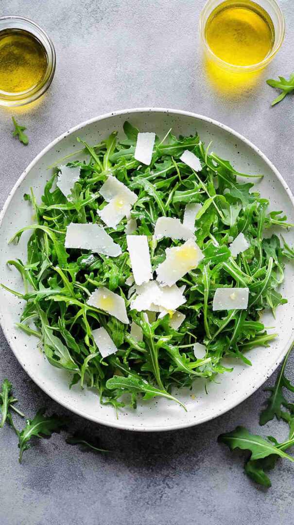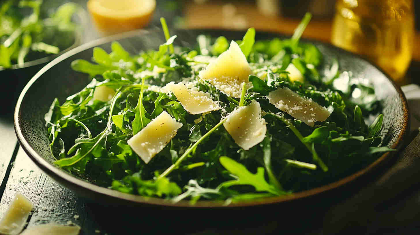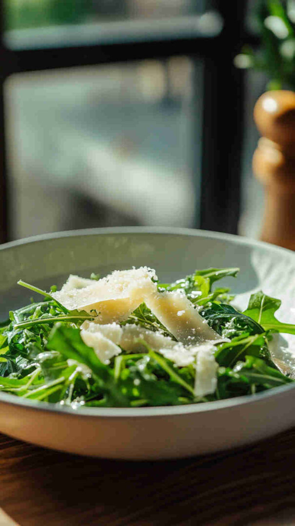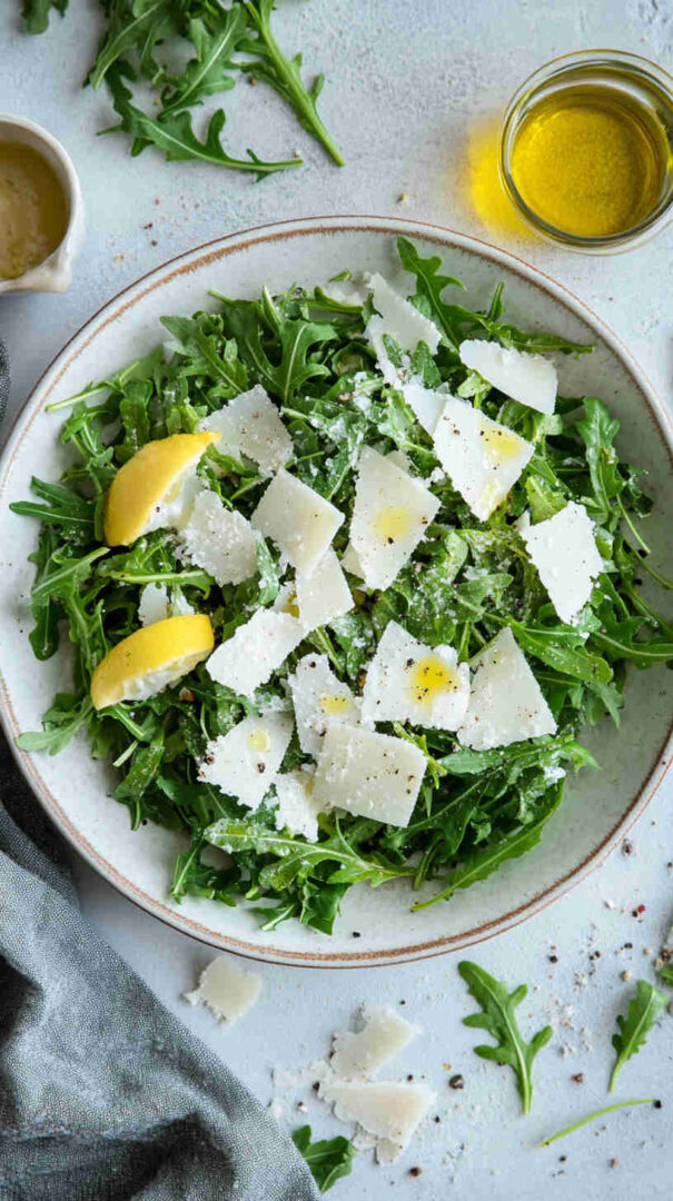 Peppery arugula with shaved Parmesan, lemon vinaigrette, and optional nuts—fresh, bright, elegant simplicity.