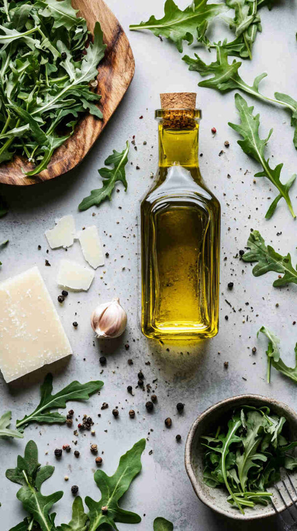 Baby arugula is the star—its tender leaves and distinctive peppery, slightly bitter flavor create the backbone of the salad; choose vibrant, unwilted bunches. Parmigiano-Reggiano (aged 24+ months preferred) delivers complex nutty, salty, crystalline crunch—never substitute domestic “Parmesan.”