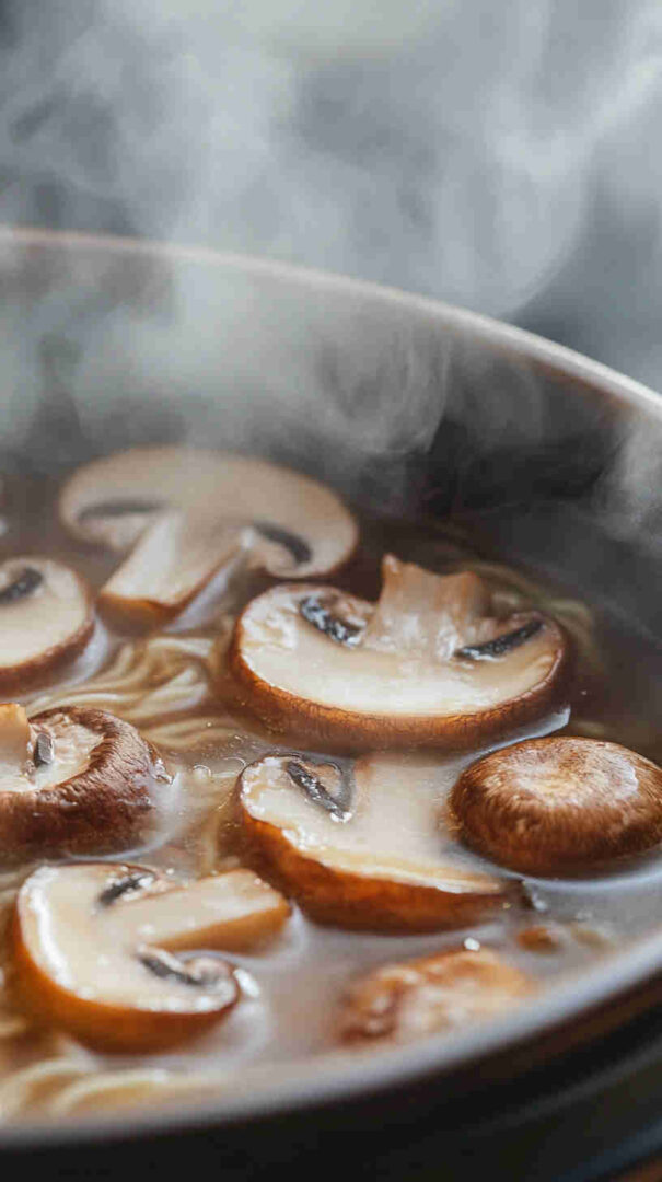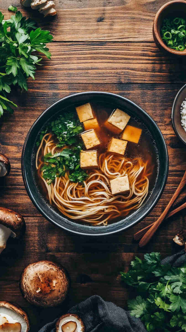 - Assemble your masterpiece. Divide cooked noodles into deep bowls. Ladle steaming hot broth, mushrooms, tofu, and greens generously over top.