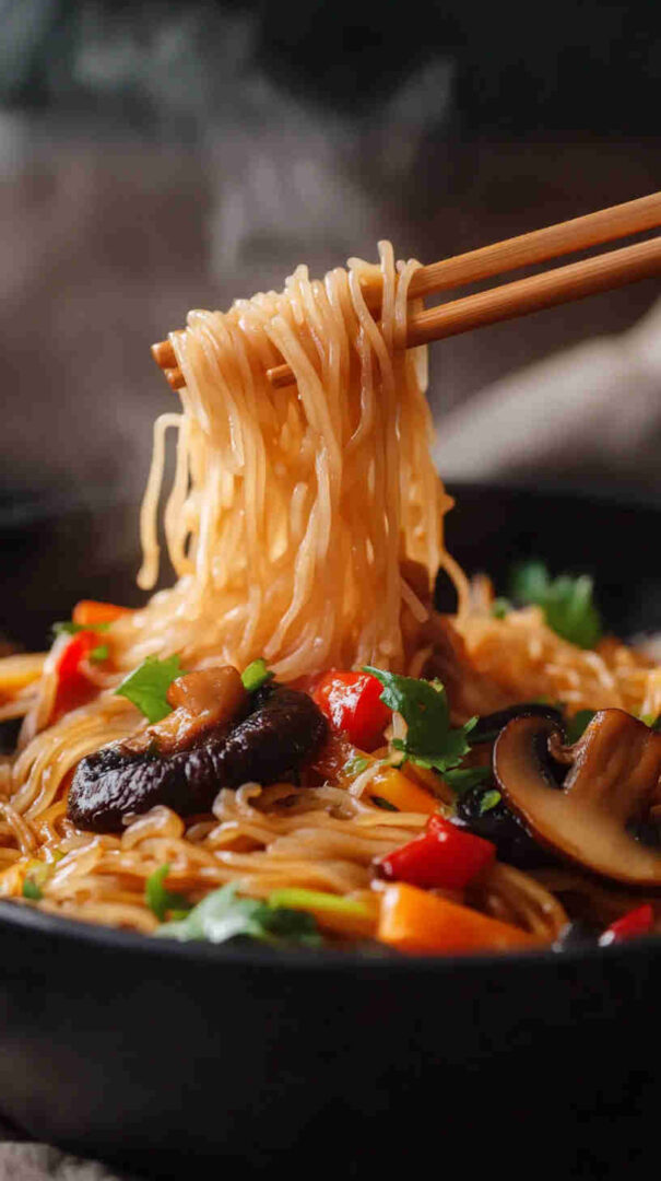 Quick, umami-packed Asian mushroom rice noodle stir fry with garlic-ginger sauce—vegan, gluten-free, and ready in 30 minutes.