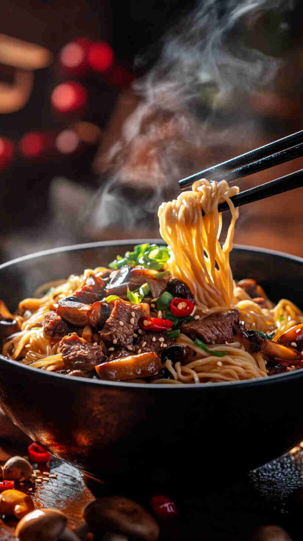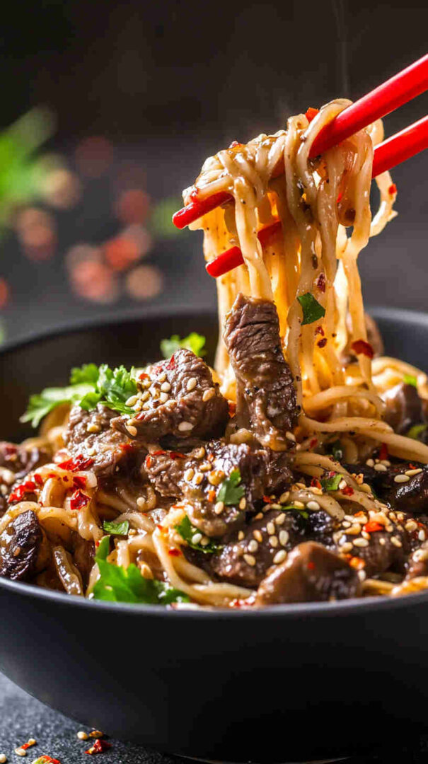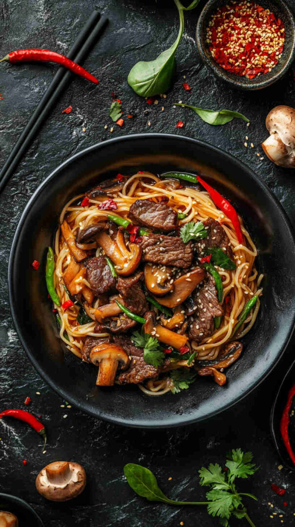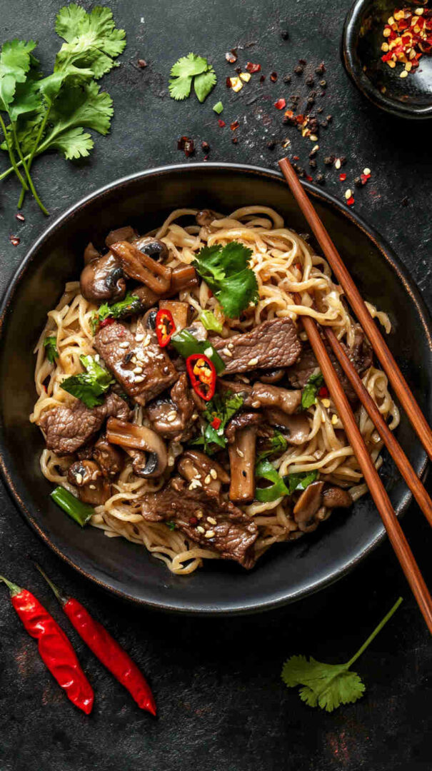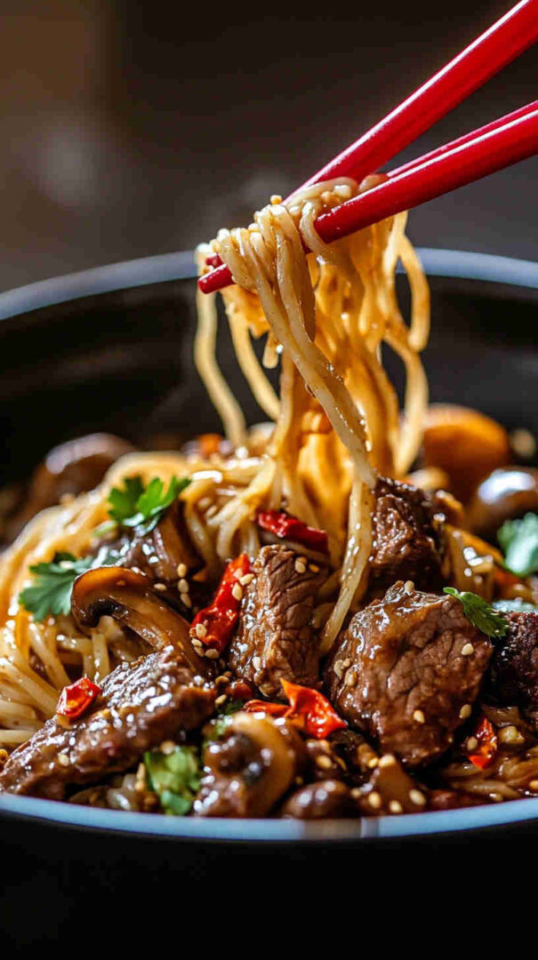 Quick stir-fried beef, earthy mushrooms, and noodles in savory Asian sauce—tender, umami-rich comfort food ready fast!