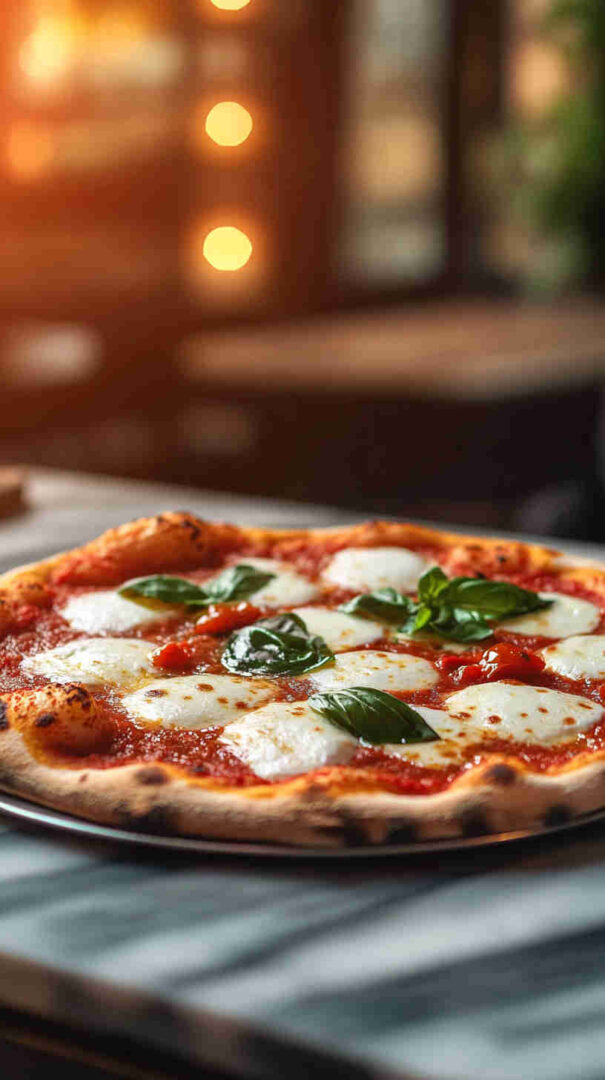 True Neapolitan Pizza Margherita features a soft, high-hydration dough stretched thin with a puffy cornicione, topped sparingly with hand-crushed San Marzano tomatoes, fresh fior di latte or buffalo mozzarella, fresh basil leaves, and extra virgin olive oil. Baked blistering hot for leopard-spotted char, it’s a celebration of minimalism and premium ingredients.