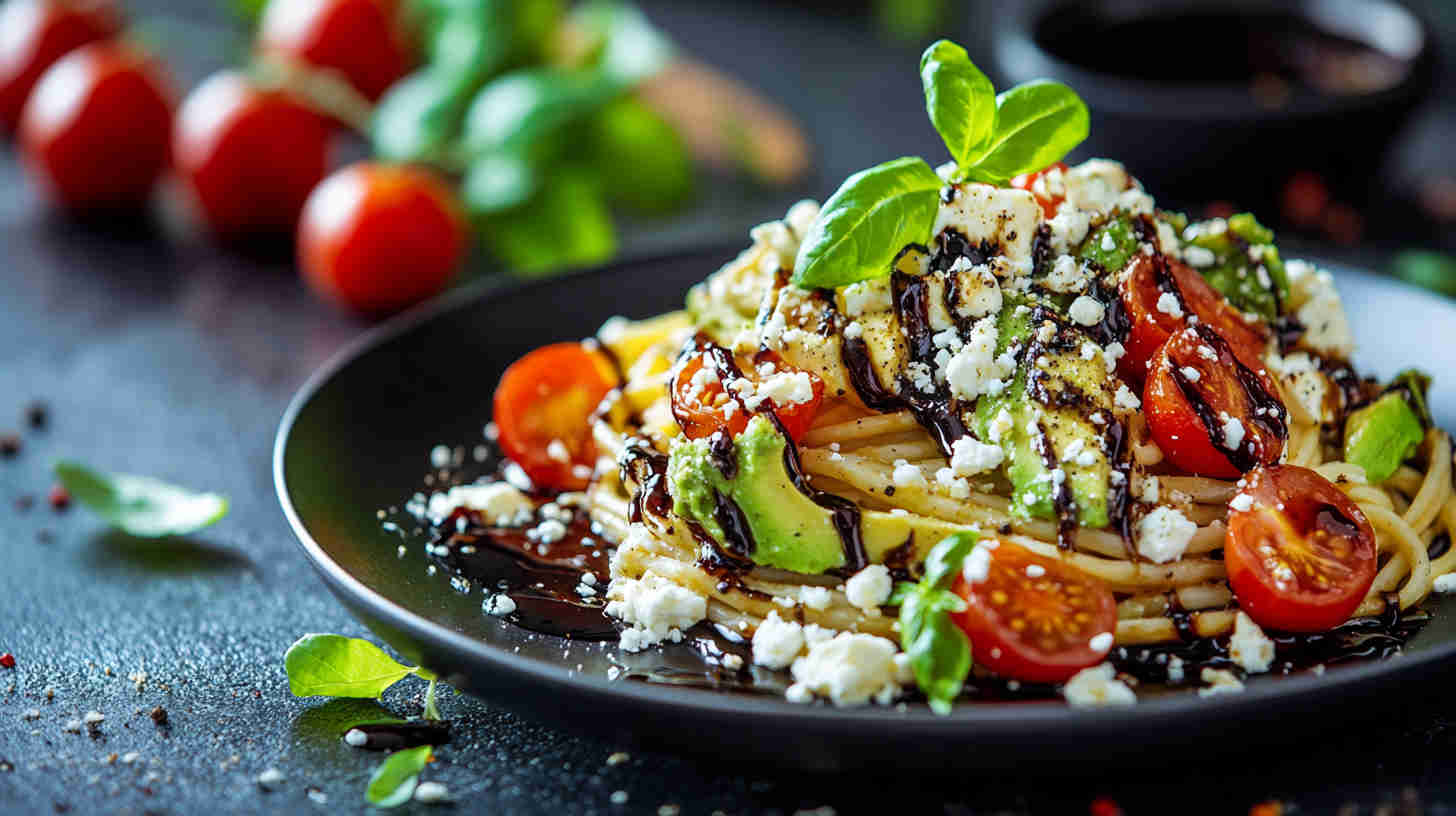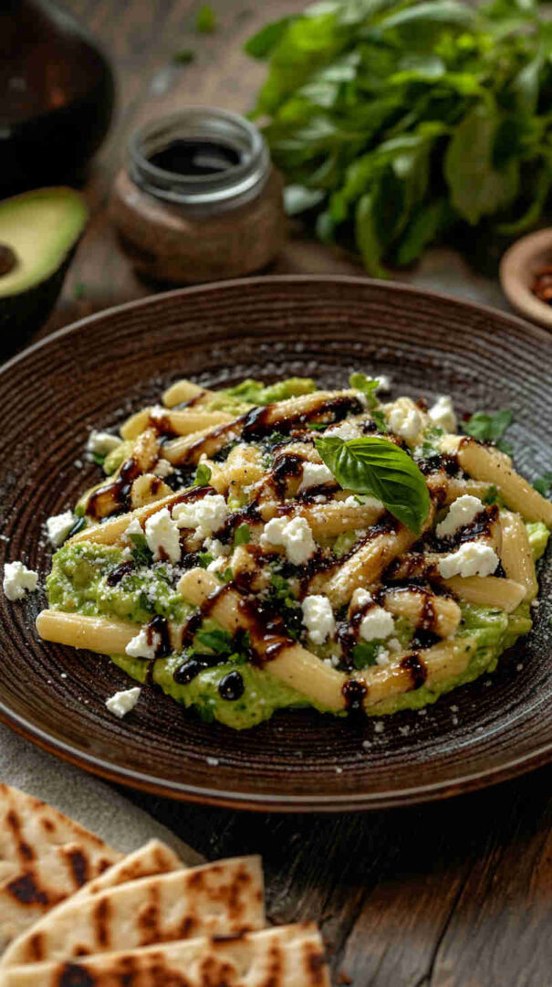 Creamy avocado-feta sauce coats pasta with juicy tomatoes, finished with tangy balsamic glaze for a fresh Mediterranean meal.