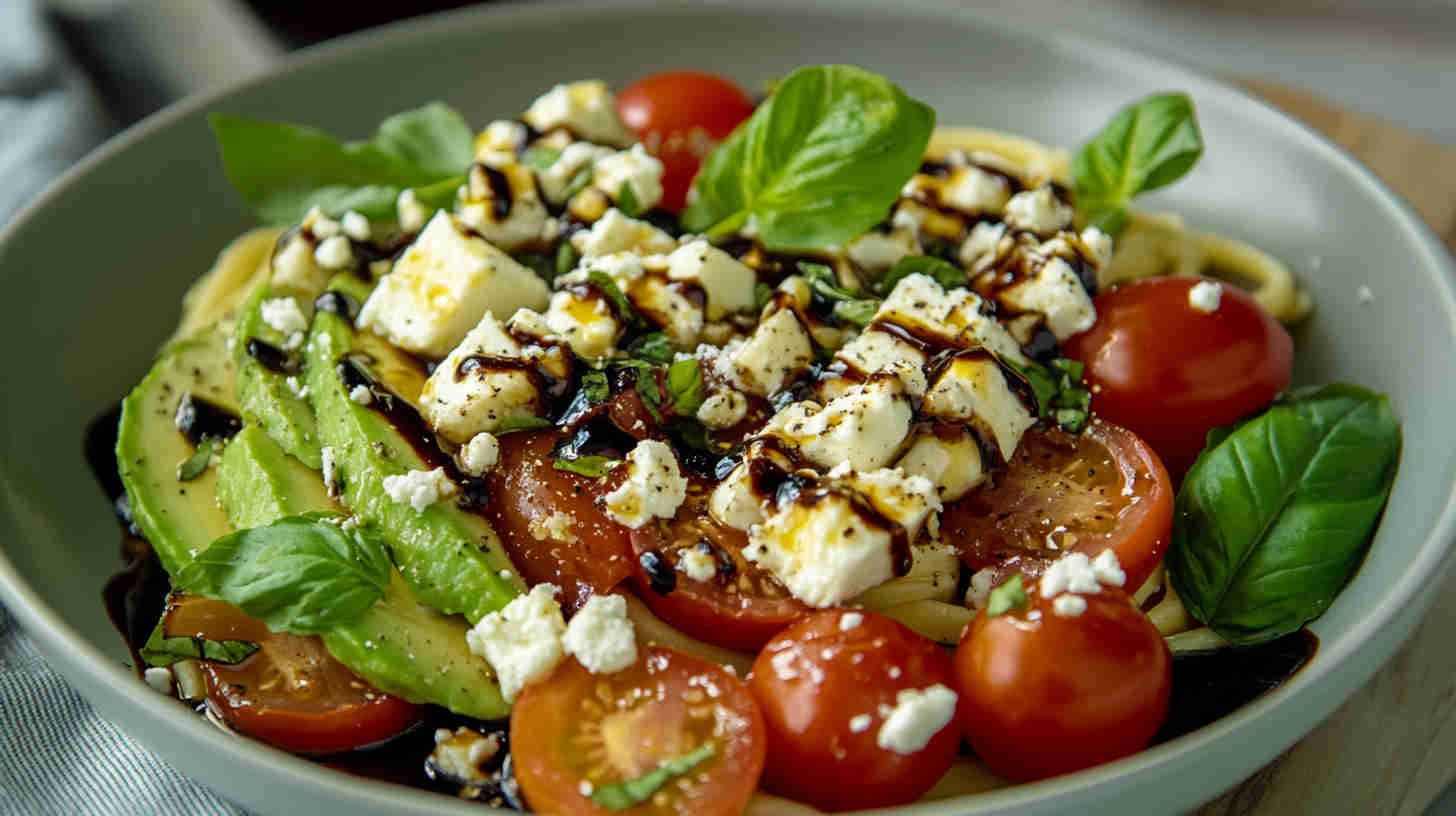 The pasta may absorb sauce, so add a splash of olive oil or water when reheating gently on the stovetop (low heat) or enjoying cold. Balsamic glaze can be stored separately to drizzle fresh. Not suitable for freezing, as avocado texture becomes grainy and watery.