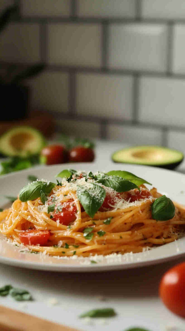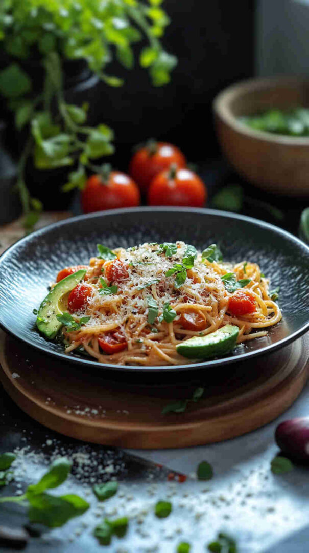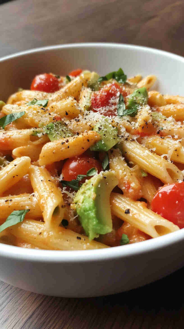 This pasta is the ultimate quick, feel-good meal that tastes far more luxurious than its simple ingredients suggest. The avocado melts into a velvety, dairy-light cream sauce that clings beautifully to the pasta, while bursting cherry tomatoes add juicy sweetness and acidity that perfectly balances the richness.