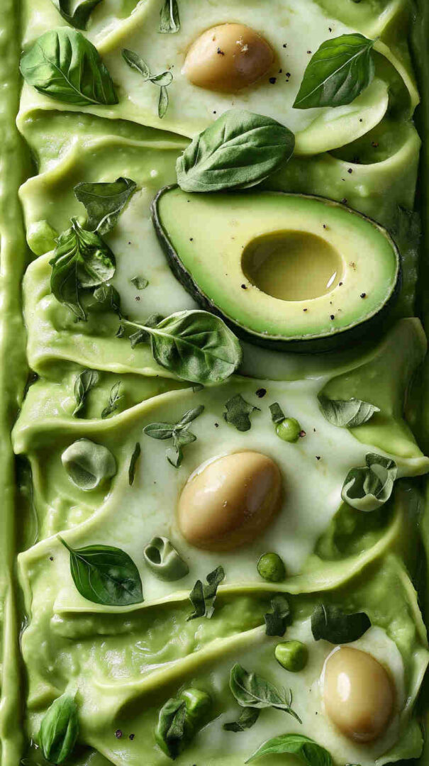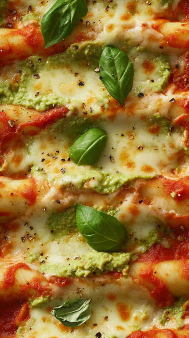 Avocado sauce browns quickly—assemble and bake promptly for best color. Vegetarian as written; vegan with plant cheese. Use low-moisture mozzarella to avoid excess water. Fresh herbs key—add most at end for vibrant flavor.