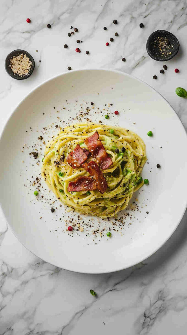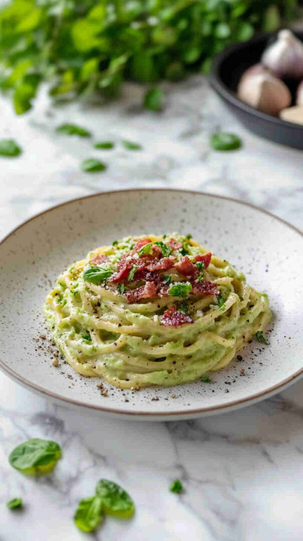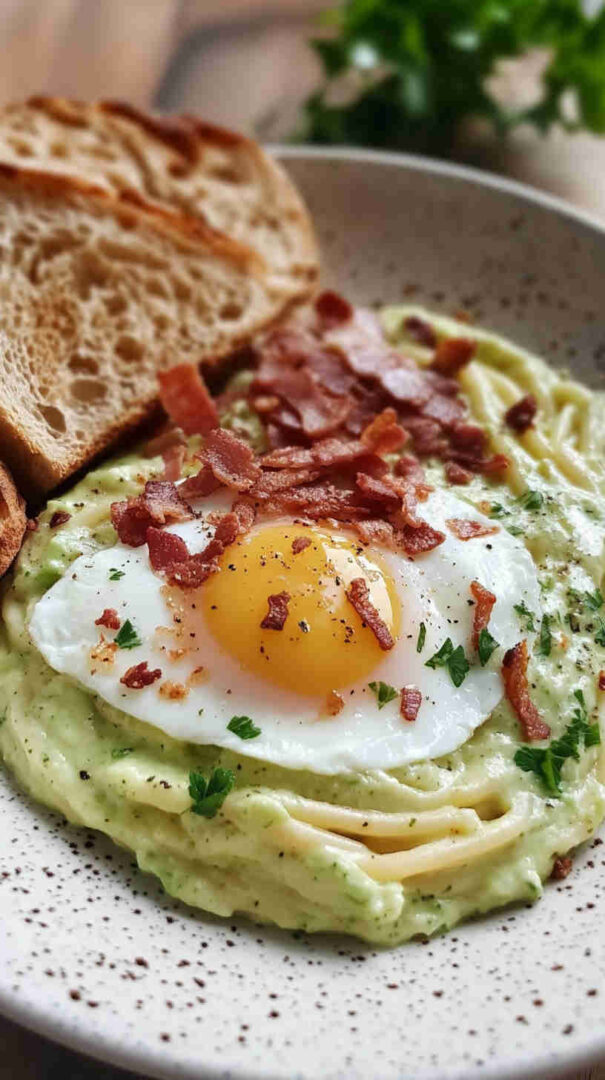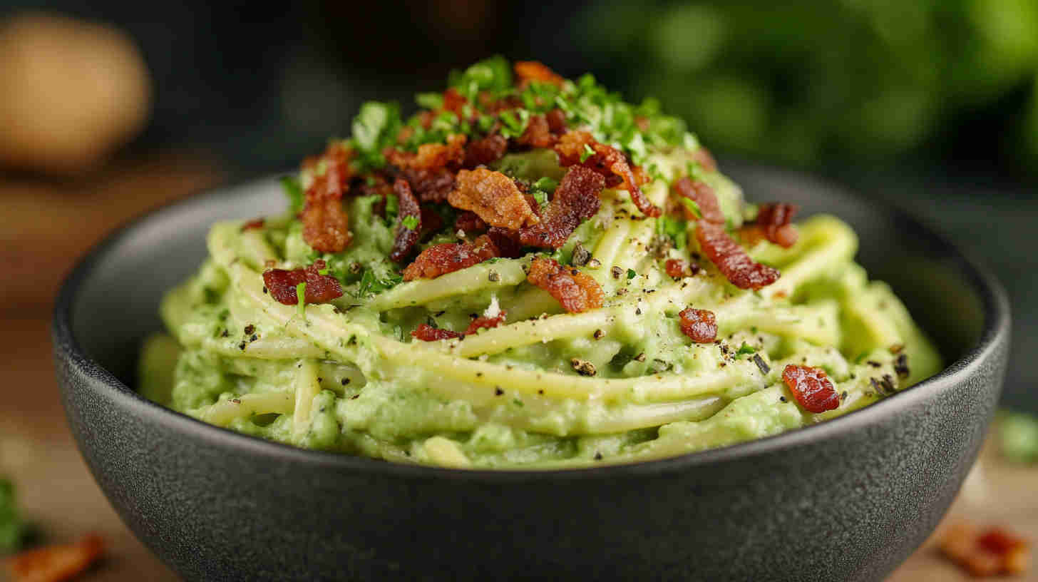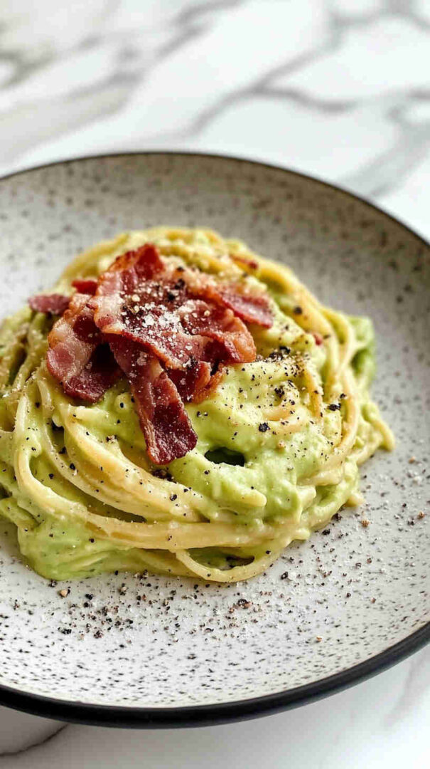 This indulgent Avocado Carbonara with Crispy Bacon reimagines the classic Roman pasta by blending ultra-creamy ripe avocados into a silky, no-cook egg-free sauce with garlic, lemon, and Parmesan. Crispy bacon bits add smoky crunch, while hot pasta gently warms the sauce into a luscious, velvety coating—rich, fresh, and irresistibly comforting.