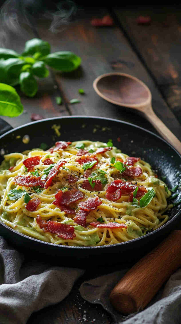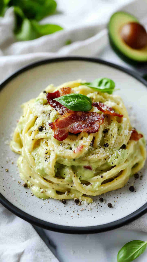 The avocado creates an unbelievably smooth, velvety sauce that clings beautifully to every strand of pasta, while the crispy bacon brings that irresistible smoky crunch and umami punch we crave in carbonara. Bright lemon and garlic keep it from feeling too heavy, and a generous shower of Parmesan adds nutty depth.