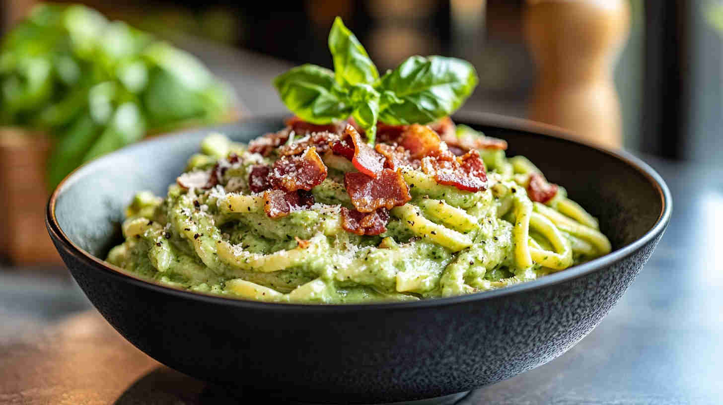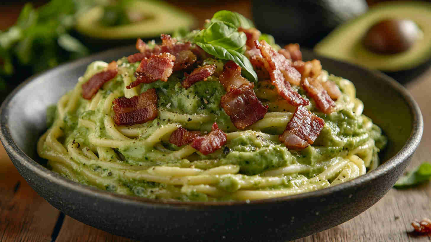 Creamy avocado carbonara sauce with crispy bacon and Parmesan coats pasta for a fresh, indulgent twist