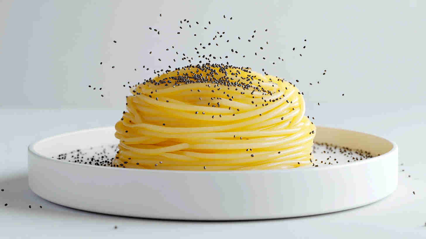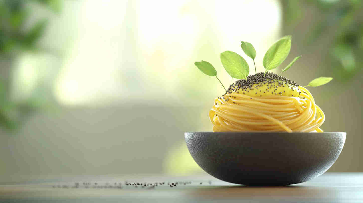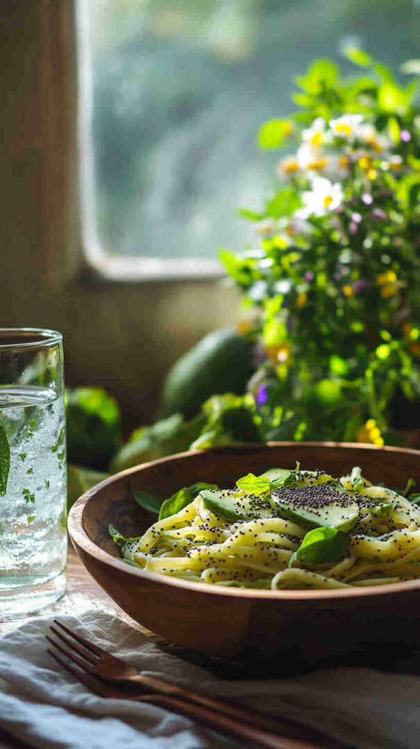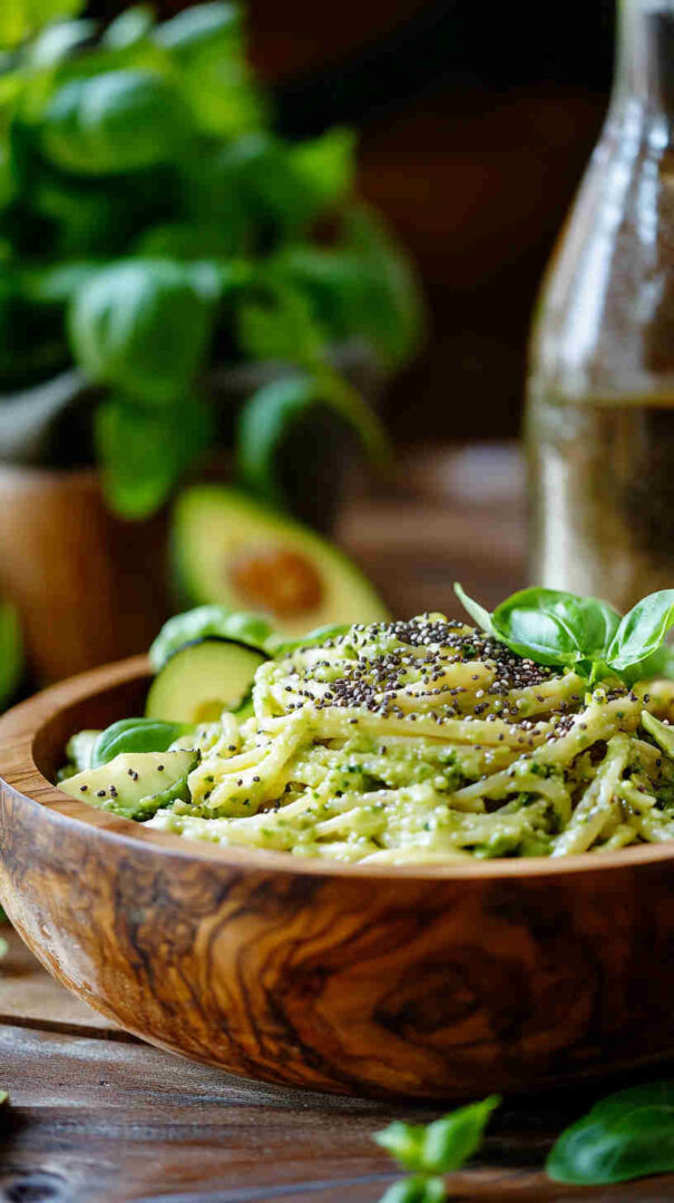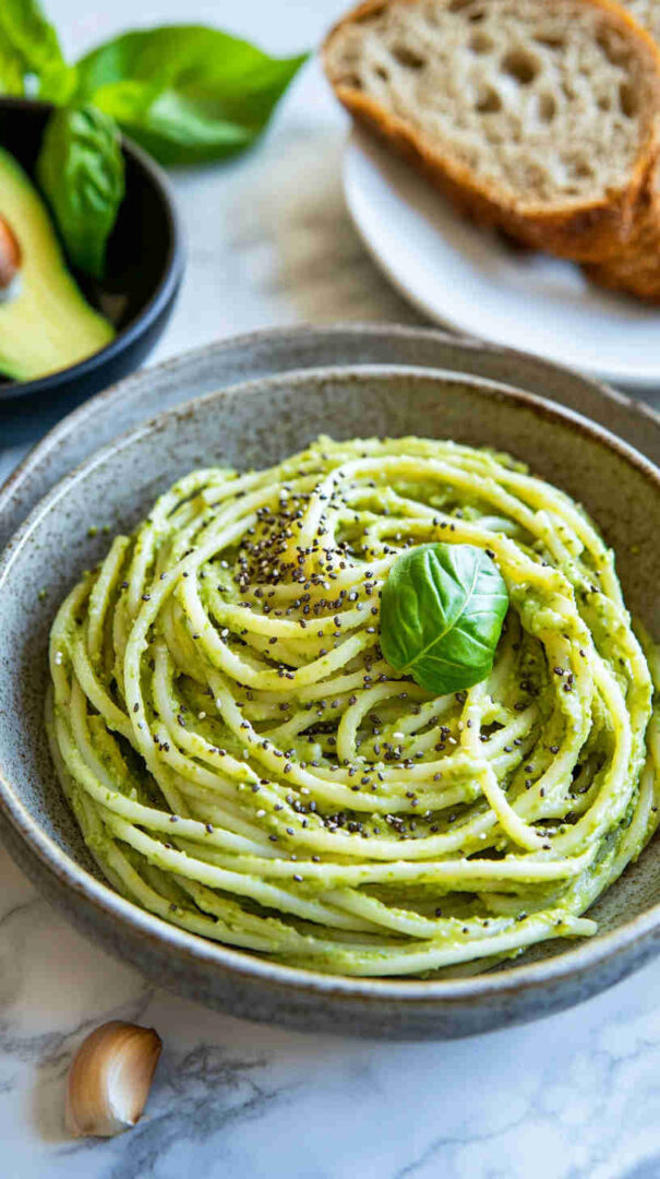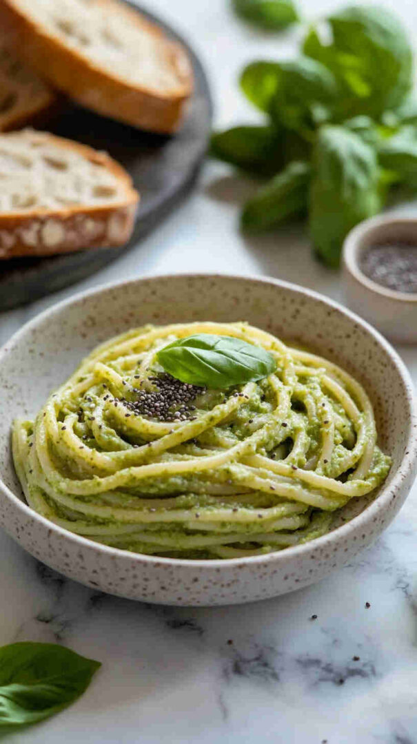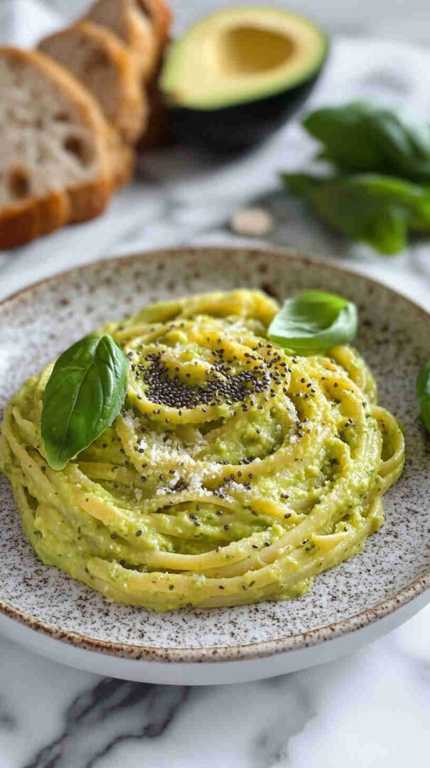 Silky avocado pasta with nutty chia seeds, bright lemon, and rich olive oil—fresh, healthy, and elegant.