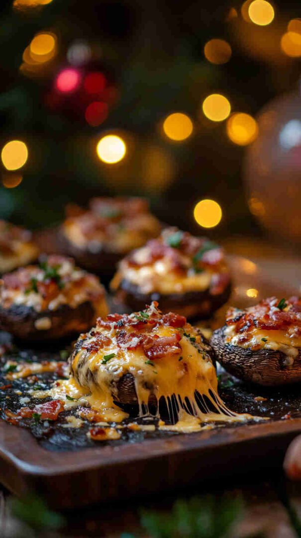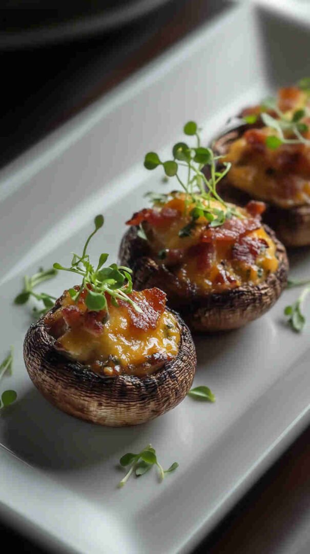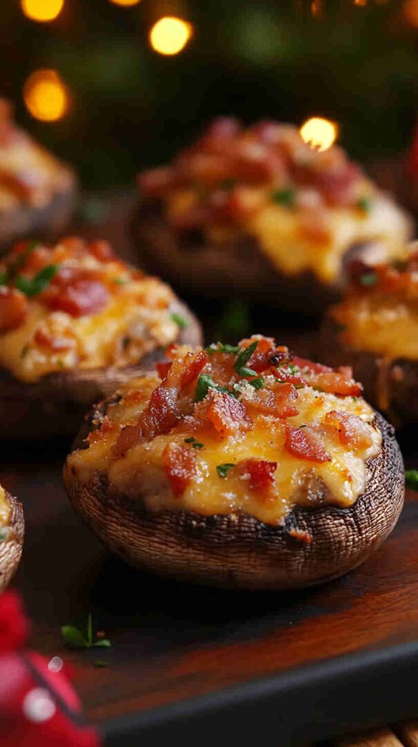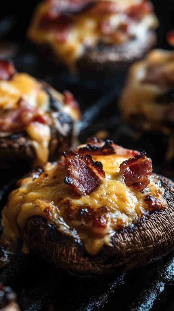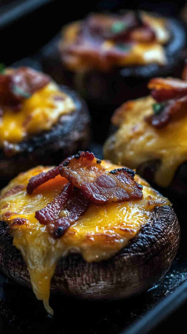 Cheesy, bacon-loaded stuffed mushrooms baked until golden — smoky, savory, and utterly addictive bites!