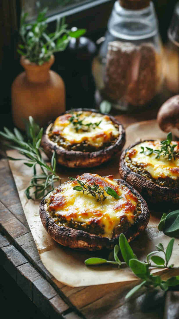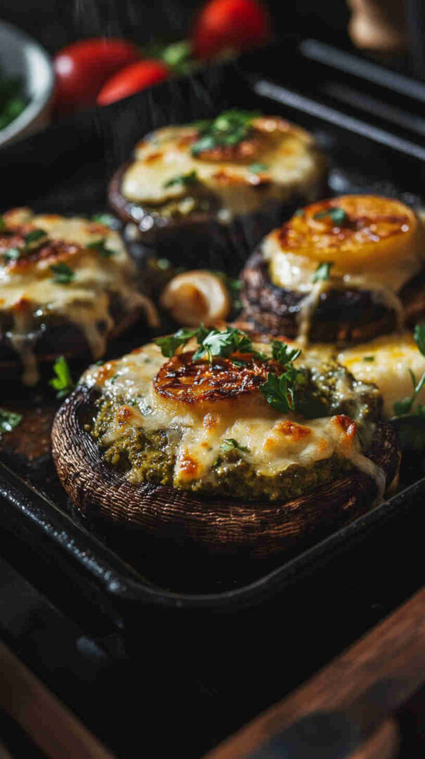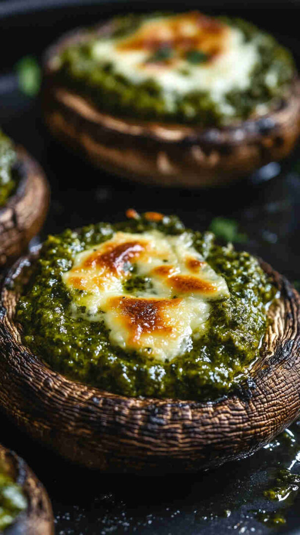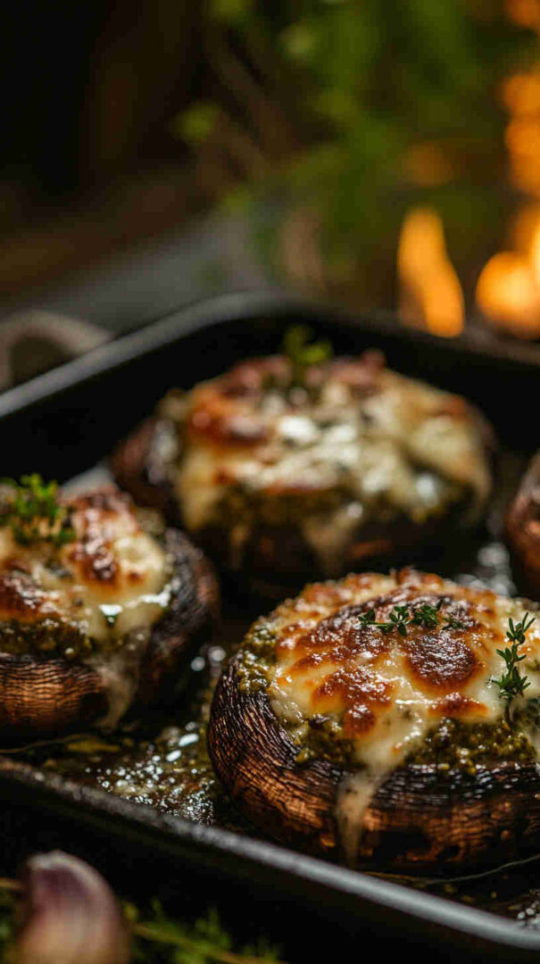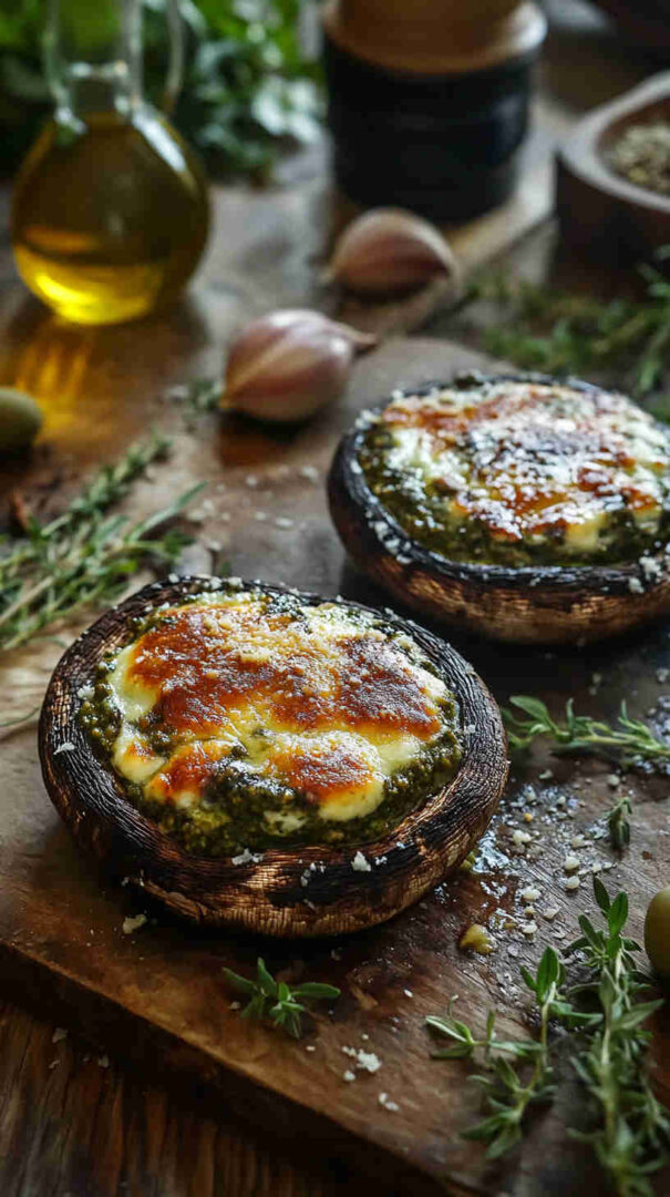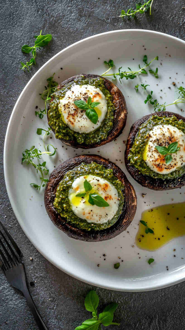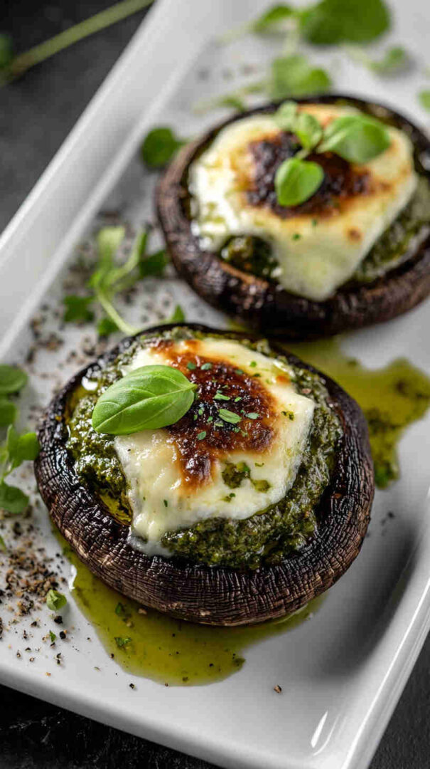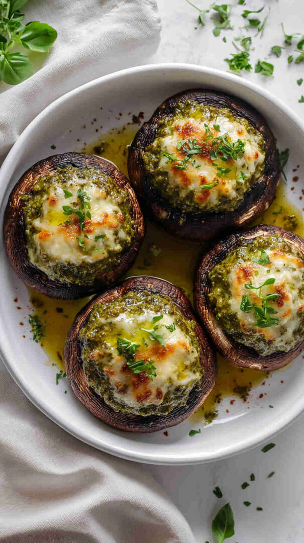 Portobello mushrooms are the star here—their large size and hearty, steak-like texture make them ideal for stuffing. Choose firm, fresh caps with smooth tops and no slimy spots. Basil pesto brings bright, herby notes from fresh basil, garlic, pine nuts, Parmesan, and olive oil; homemade offers superior flavor, but quality store-bought works wonderfully too.