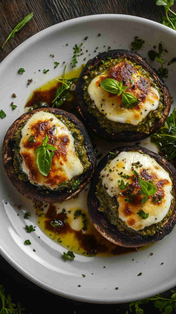 Baked Stuffed Portobello Mushrooms with Pesto and Mozzarella