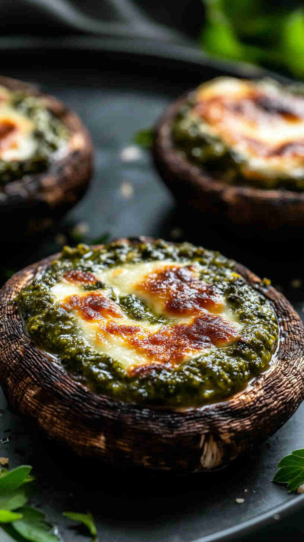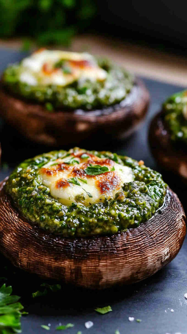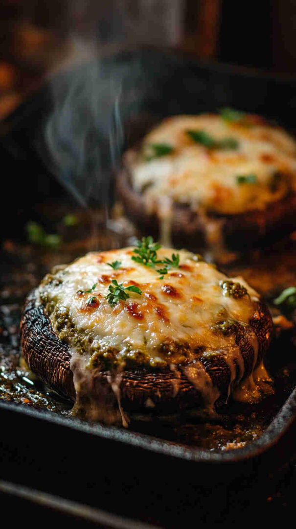Tender portobello mushrooms stuffed with basil pesto and topped with melted mozzarella—baked to cheesy, herby perfection!