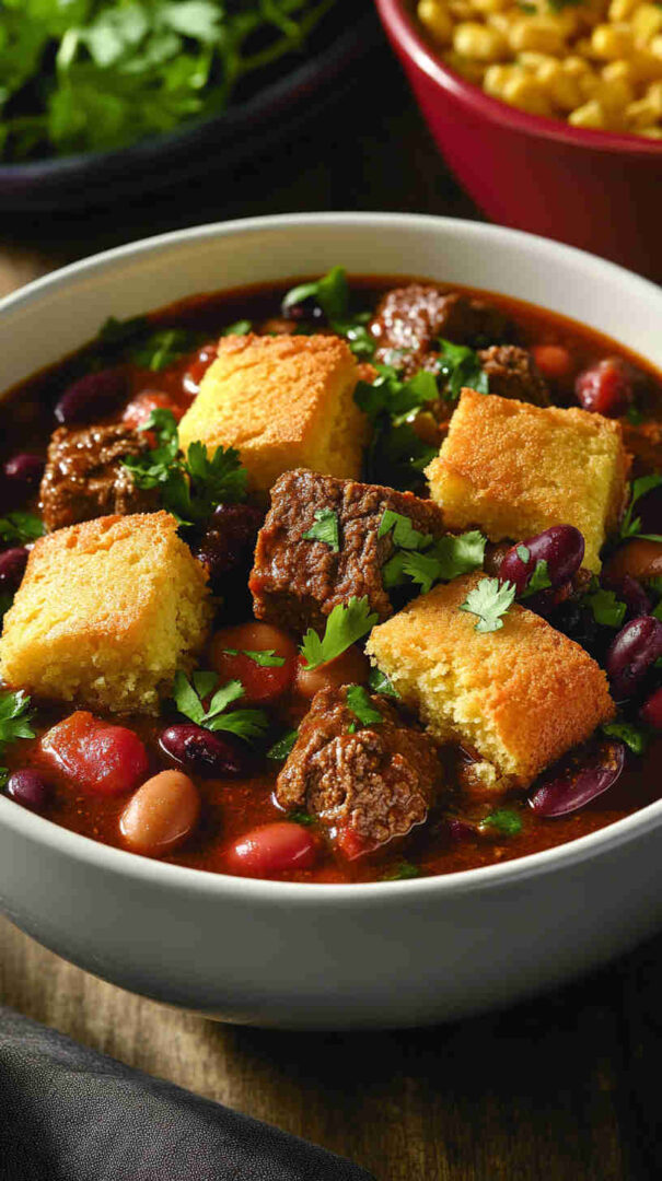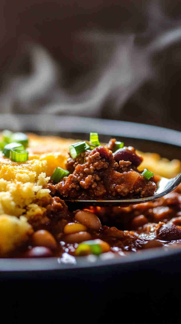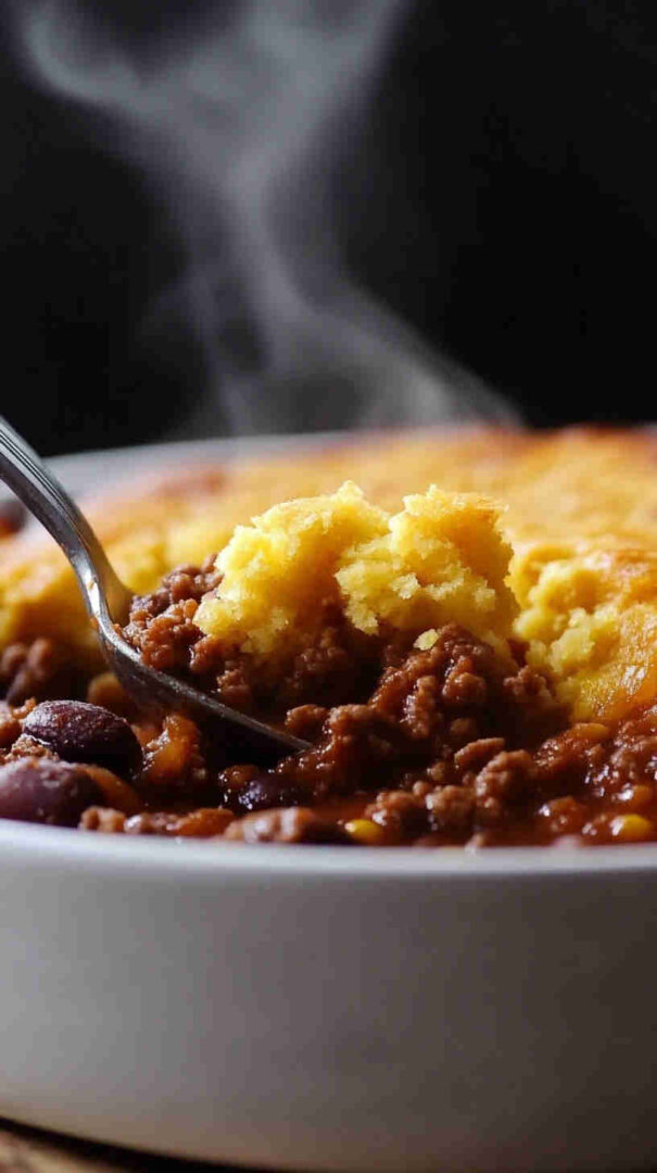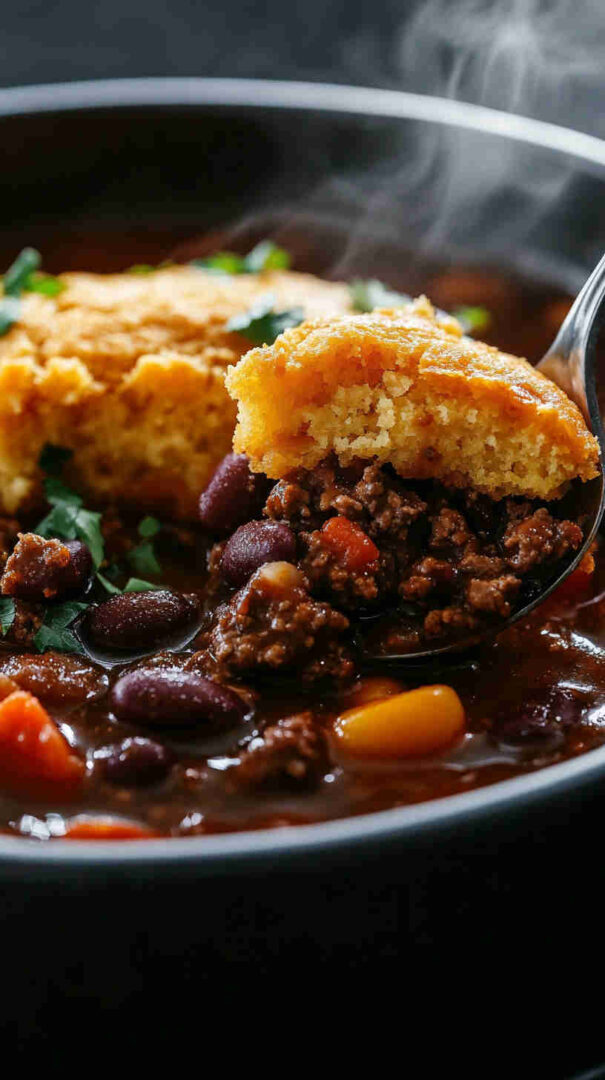 Then comes the genius part: a fluffy, buttery cornbread topping that bakes golden and crisp on the edges while staying soft and moist inside, soaking up all those delicious chili juices.