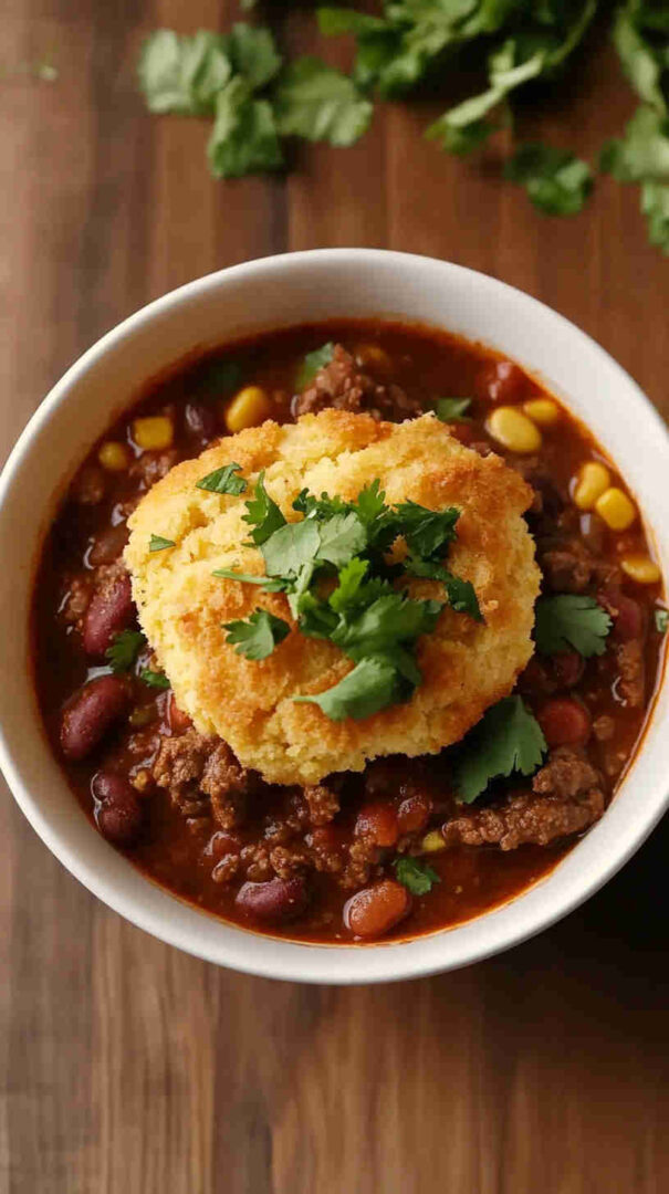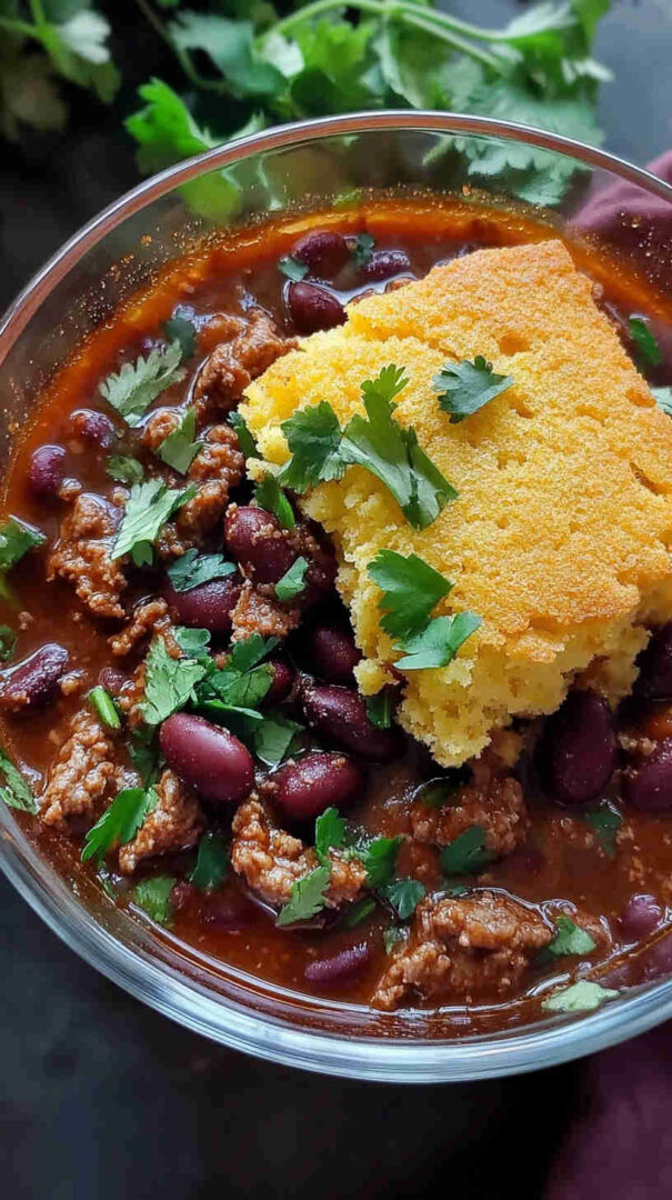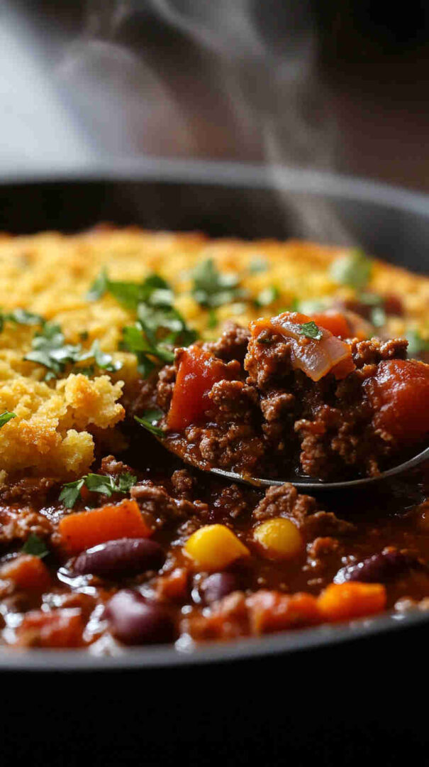 Hearty ground beef chili with beans, topped with golden cornbread—comforting, flavorful one-dish meal perfect for cozy dinners.