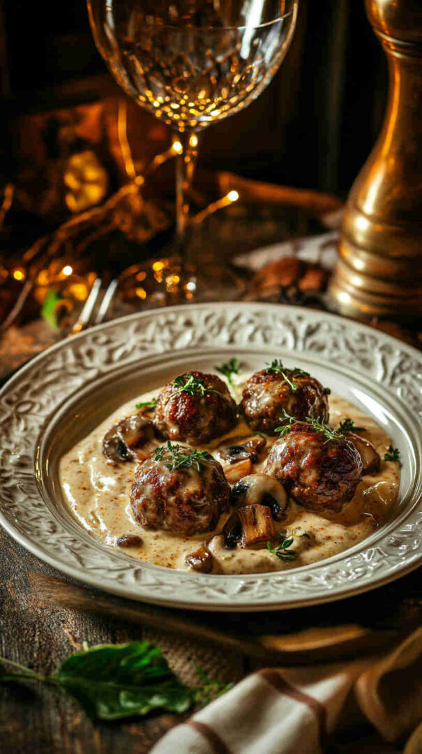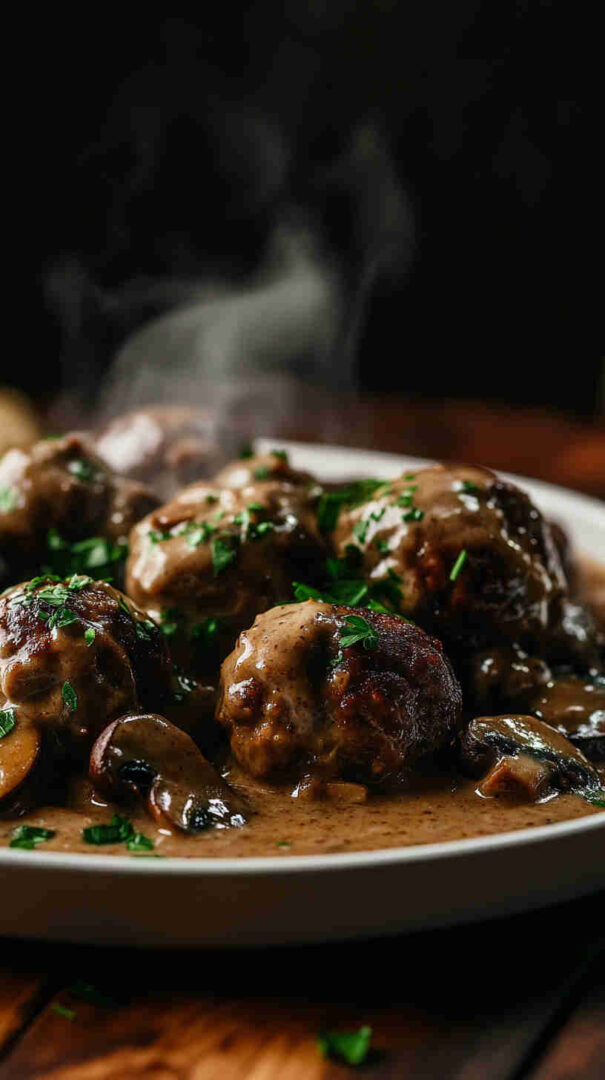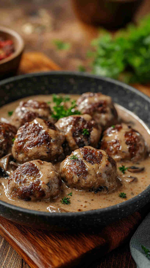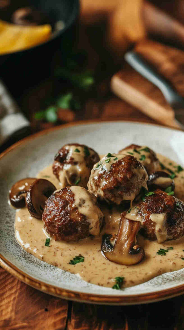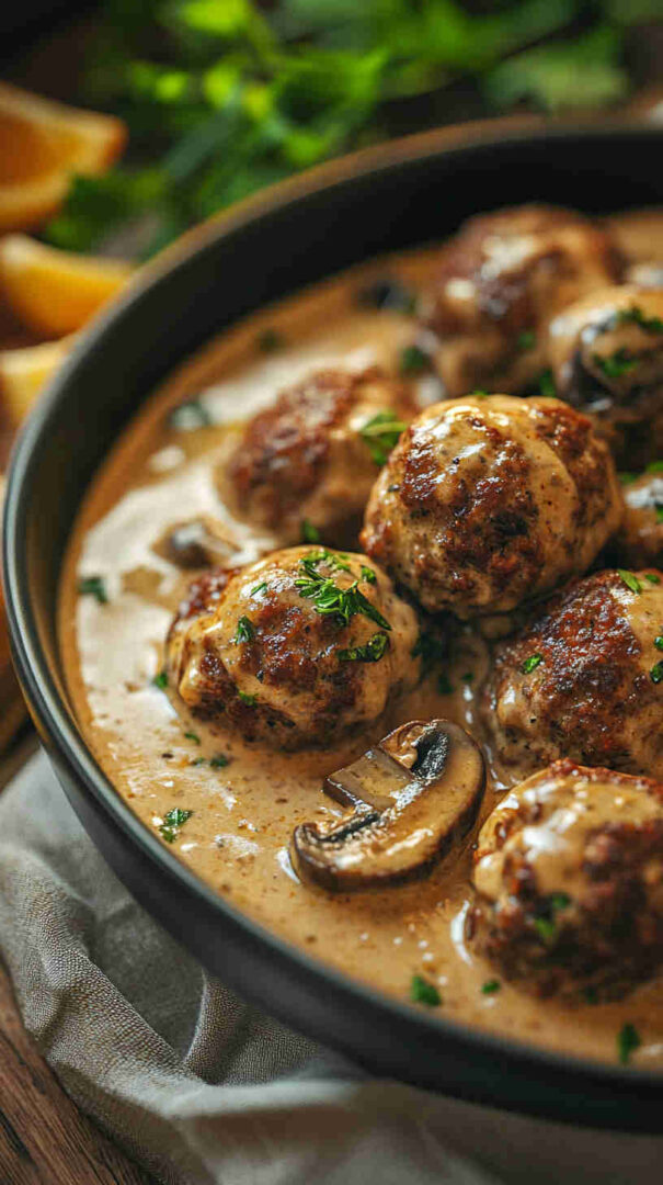 Baking them first locks in the juices and gives a nice texture, while the creamy sauce—rich with sautéed mushrooms, garlic, a touch of broth, and heavy cream—clings beautifully to every meatball. It’s elegant enough for date night or company but simple and forgiving for weeknight dinners.