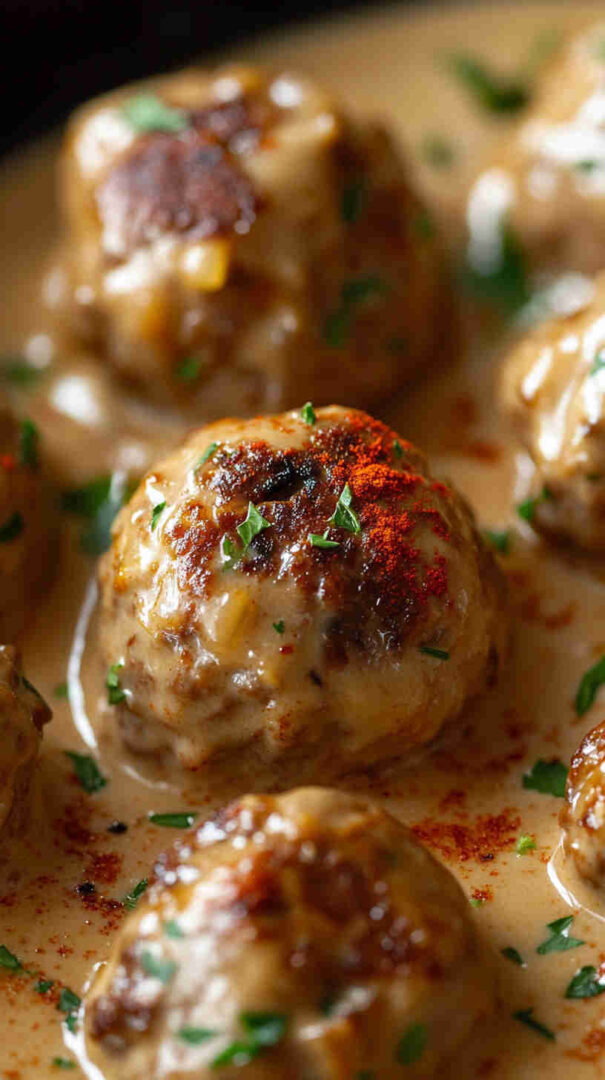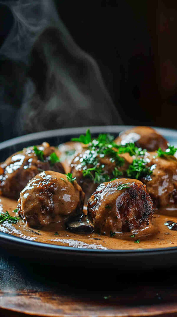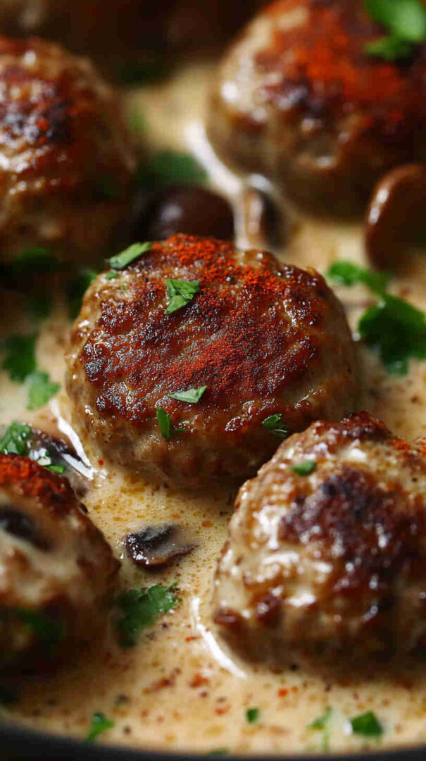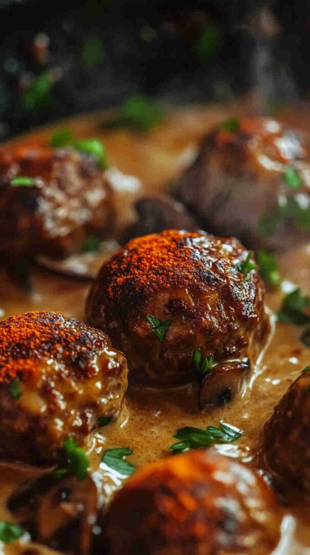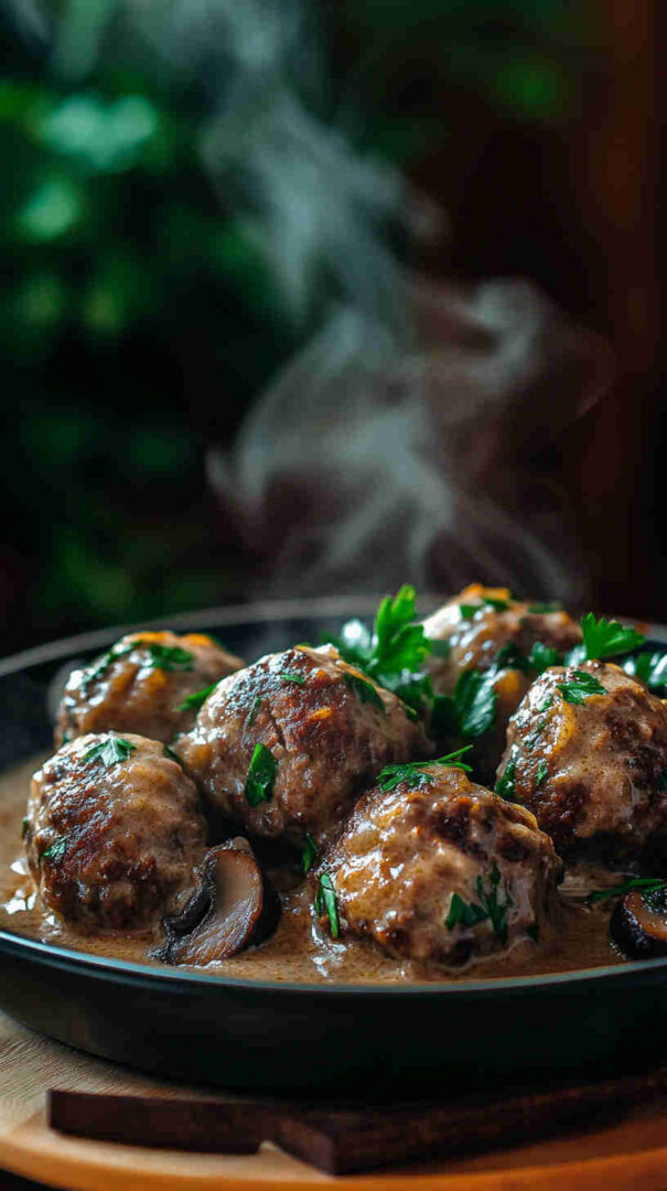 Juicy, tender beef meatballs packed with earthy mushrooms are baked to perfection, then nestled in a luscious, garlicky creamy sauce for ultimate comfort. This hearty dish combines savory beef with umami-rich mushrooms in every bite.