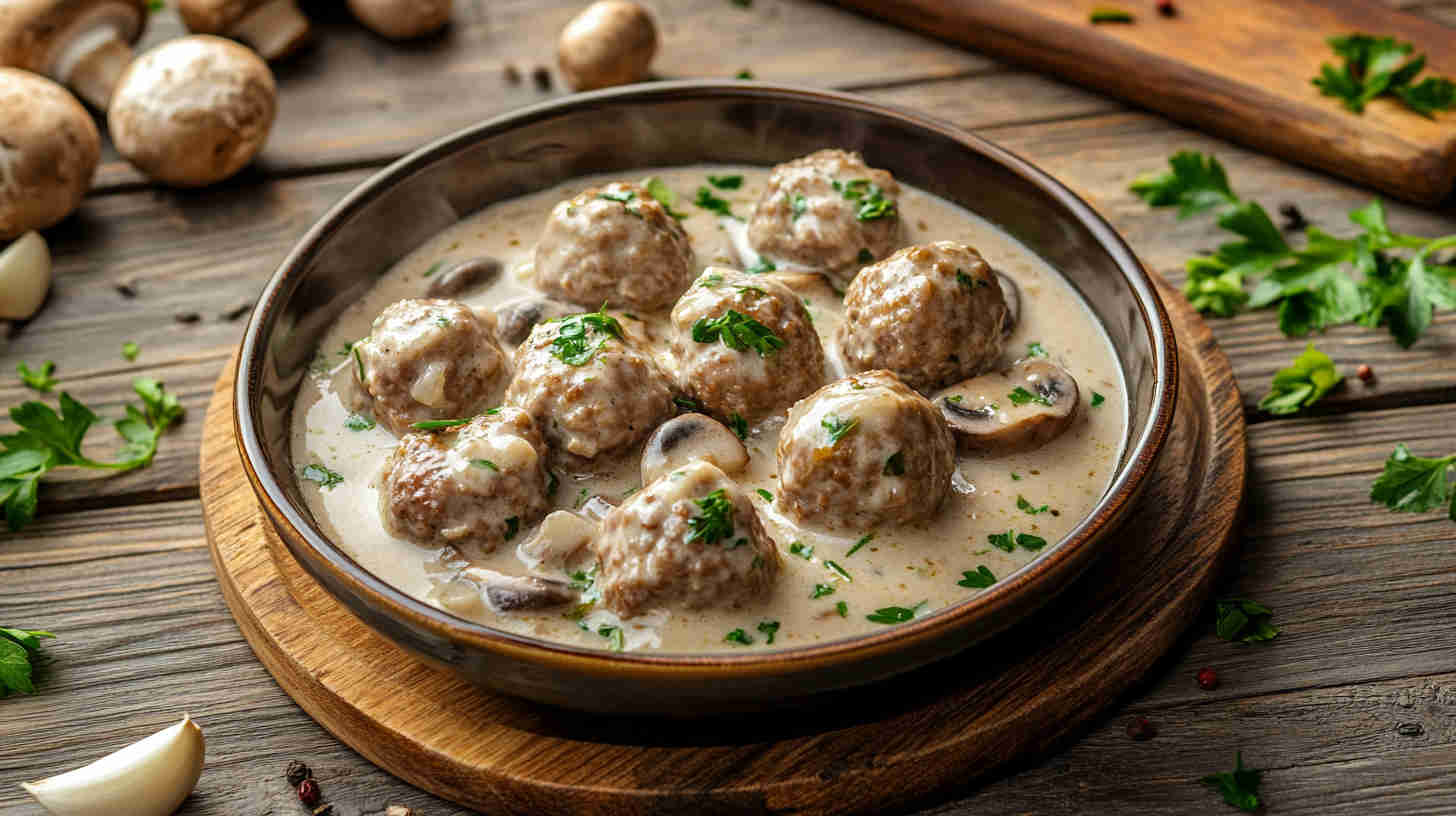 Juicy, tender beef meatballs packed with earthy mushrooms are baked to perfection, then nestled in a luscious, garlicky creamy sauce for ultimate comfort. This hearty dish combines savory beef with umami-rich mushrooms in every bite.