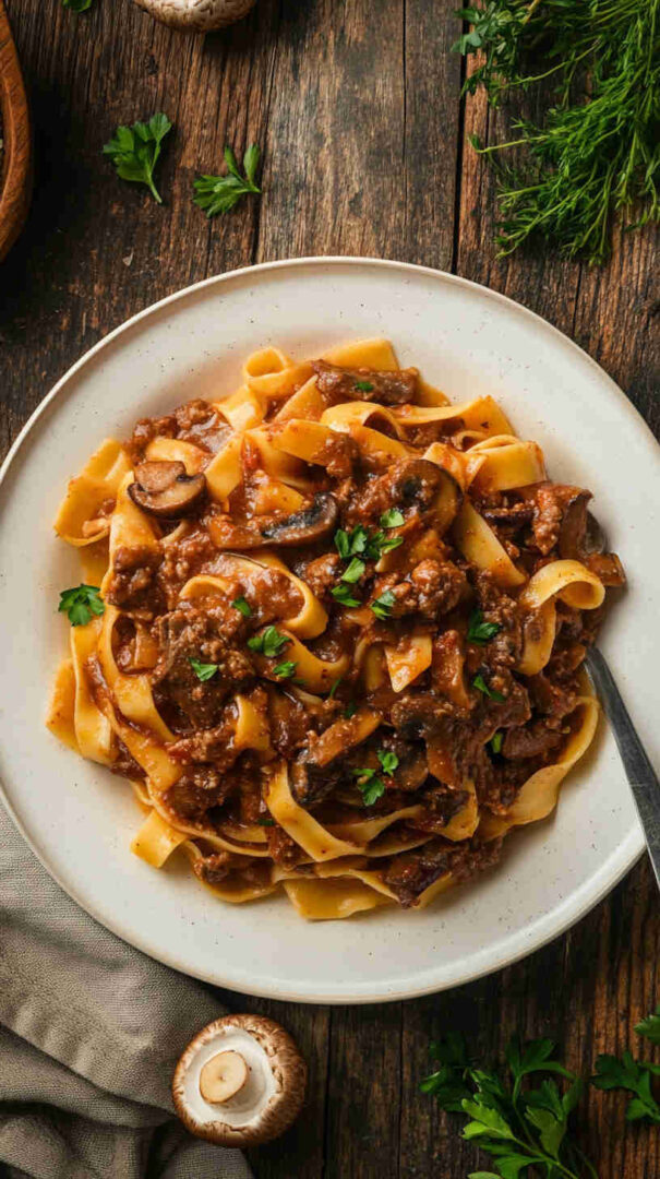 Ground beef (lean or 80/20) provides the hearty base—choose quality for better flavor, and avoid super-lean to keep the sauce moist and rich. Cremini (baby bella) mushrooms are ideal for their earthy depth and firm texture; white button work too, but avoid overly delicate varieties.