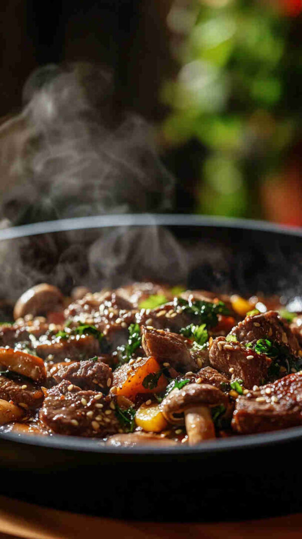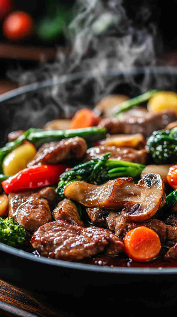 This savory Beef and Mushroom Stir-Fry features thinly sliced tender beef and hearty mushrooms tossed in a glossy soy ginger sauce that’s umami-rich, slightly sweet, and aromatic. Ready in under 30 minutes, it’s a perfect weeknight dinner over rice or noodles, balancing bold Asian flavors with simple ingredients.