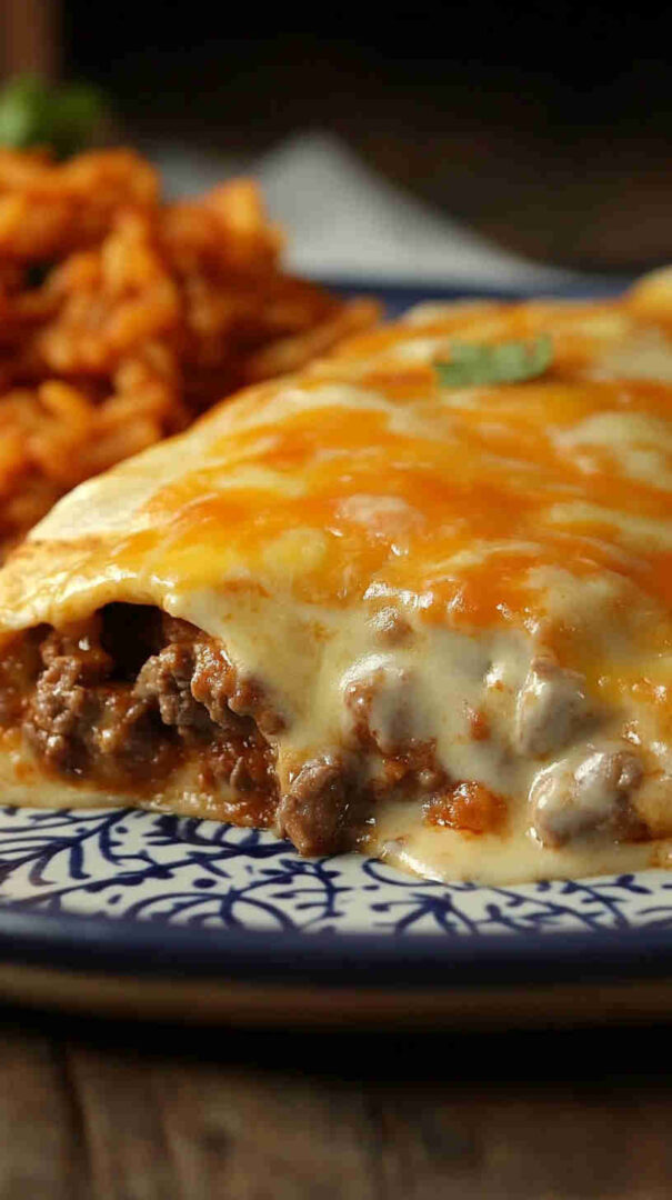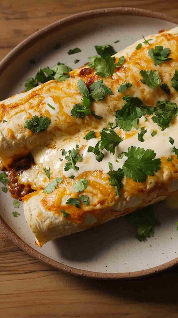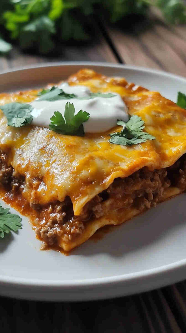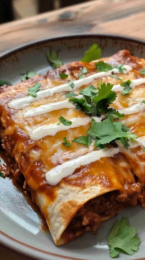 Soft flour tortillas filled with savory seasoned ground beef, onions, and green chiles, then rolled and baked under a luscious, creamy sour cream sauce blended with broth, spices, and more chiles. Topped with melted cheddar for gooey perfection—this Tex-Mex classic is rich, comforting, and full of tangy, creamy flavor.