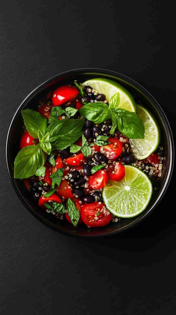 Quinoa is the protein-rich base—white, red, or tri-color varieties all work; it’s a complete protein with a light, fluffy texture when cooked properly. Black beans (canned, rinsed well) provide creamy texture, plant protein, and fiber—low-sodium preferred.