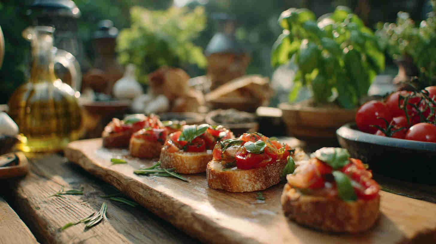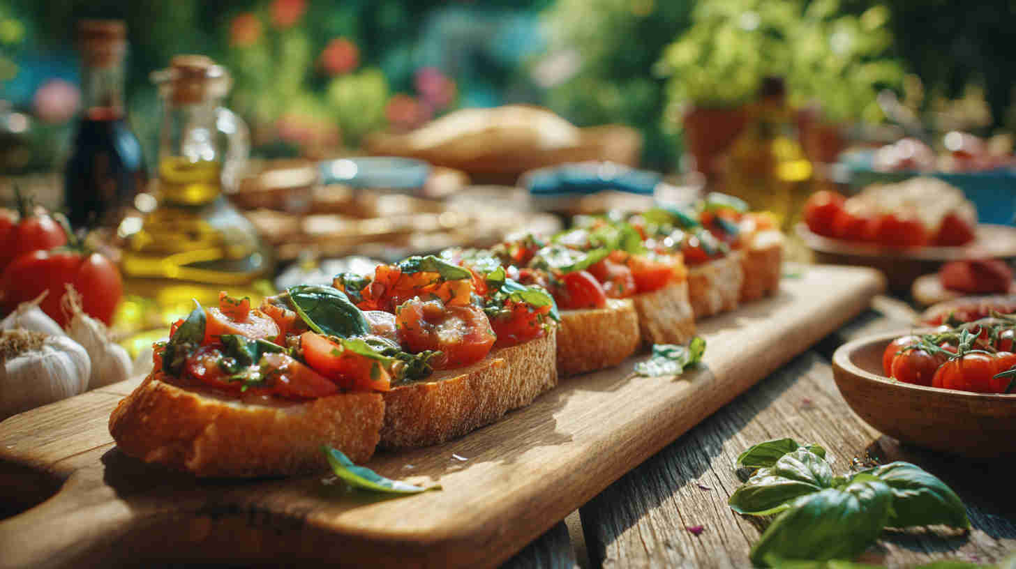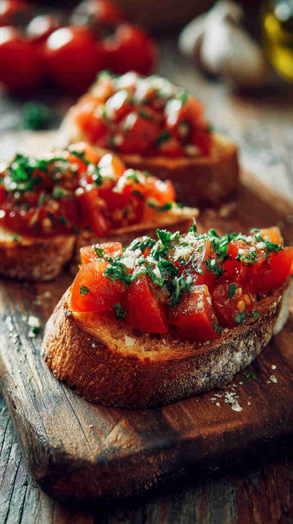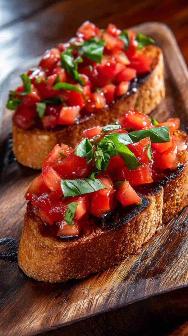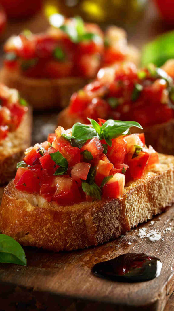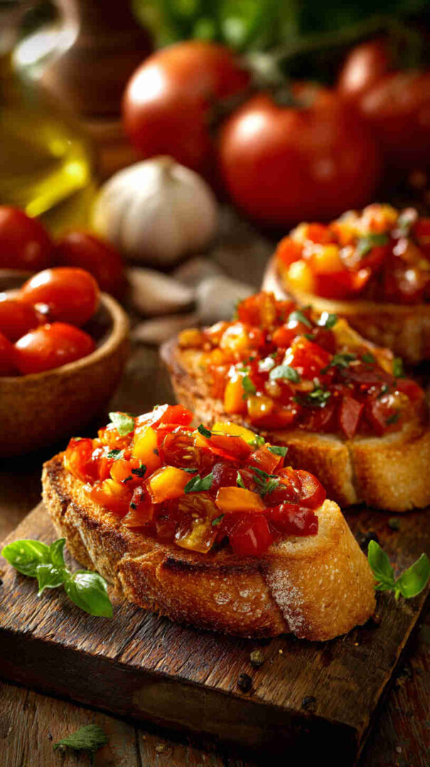 Ripe, flavorful tomatoes are the heart of authentic bruschetta—choose bright red, heavy-for-size varieties at peak ripeness; Roma/plum tomatoes hold shape well when diced, while heirlooms add beautiful color and complexity.