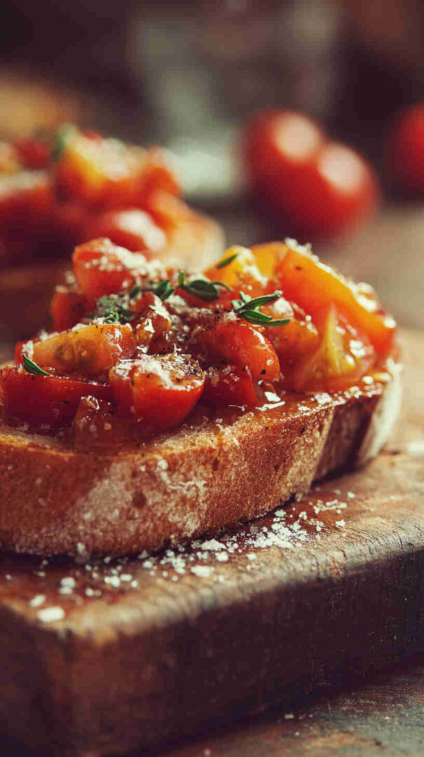 Swap basil for fresh oregano or mint in summer variations. In cooler months, roast cherry tomatoes for deeper flavor. Make mini versions on crostini for parties or serve deconstructed (bowl of tomato mix with toasts on side) for easy self-assembly.