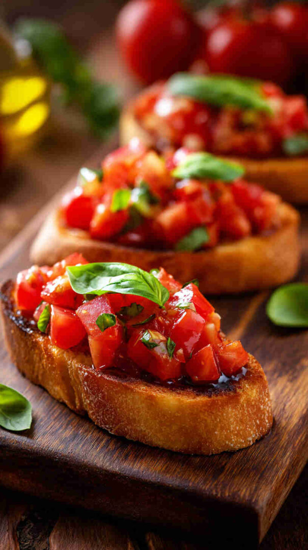 Bruschetta al Pomodoro is the quintessential Italian summer appetizer: toasted slices of crusty bread rubbed with garlic, generously topped with a vibrant mix of ripe diced tomatoes, fresh basil, extra virgin olive oil, and a touch of salt. The combination of crunchy bread, juicy sweet-tangy tomatoes, fragrant basil, and silky olive oil creates a simple yet explosive burst of fresh Mediterranean flavor in every bite. (58 words—trimmed to essence while capturing the spirit)