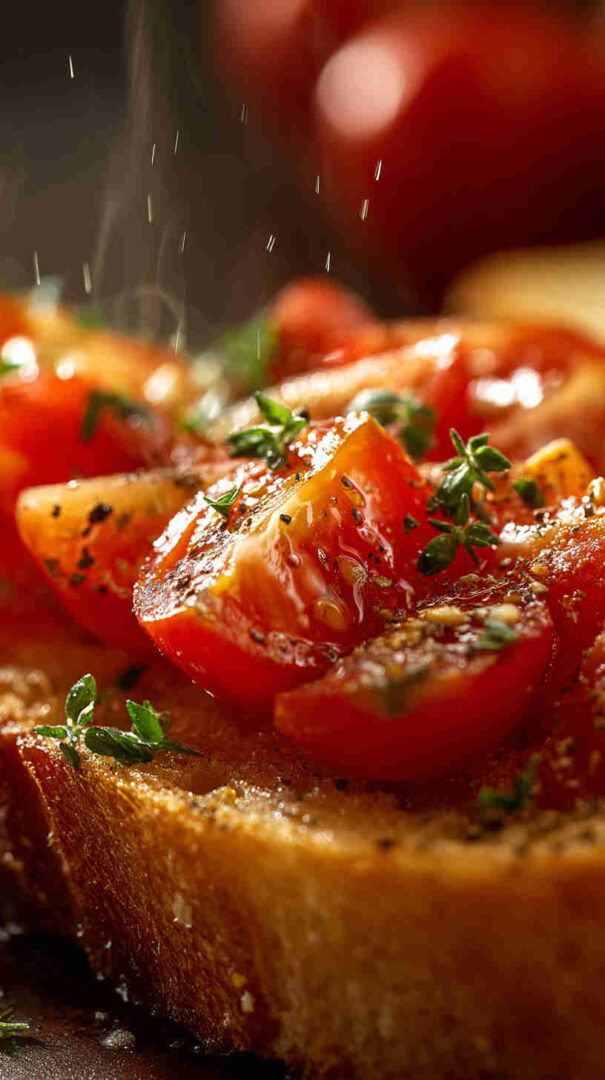 Crusty Italian bread (ciabatta, baguette, or sourdough) with a good chew and open crumb toasts beautifully and soaks up just enough oil and tomato juice. Sea salt or kosher salt enhances natural flavors; a pinch of freshly ground black pepper or a tiny splash of red wine vinegar or balsamic can brighten if tomatoes are less acidic.