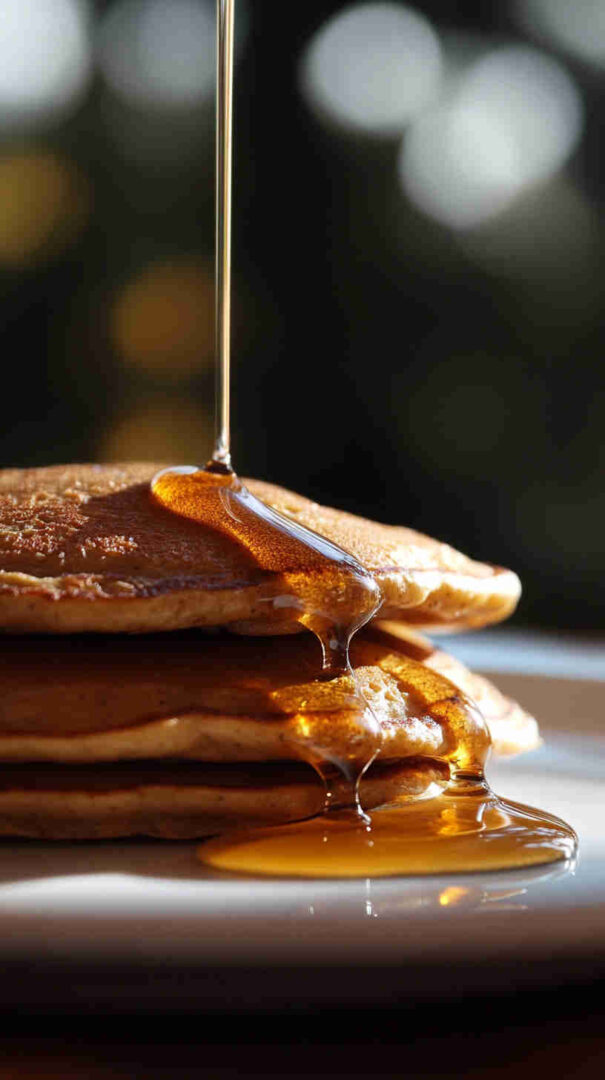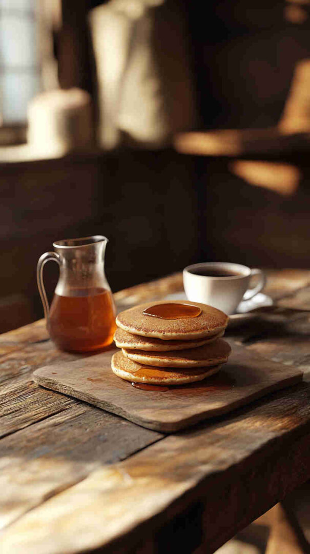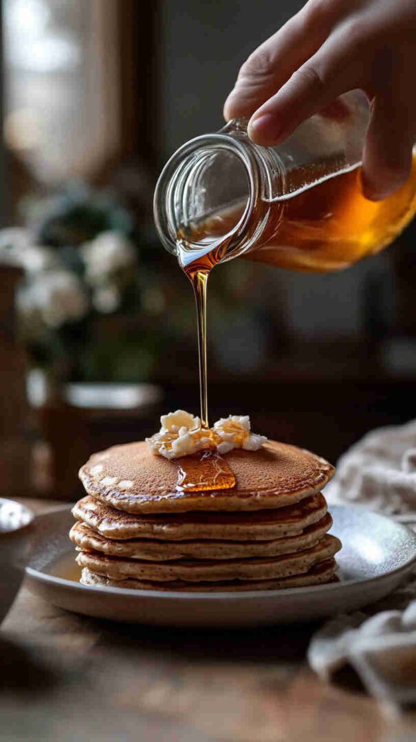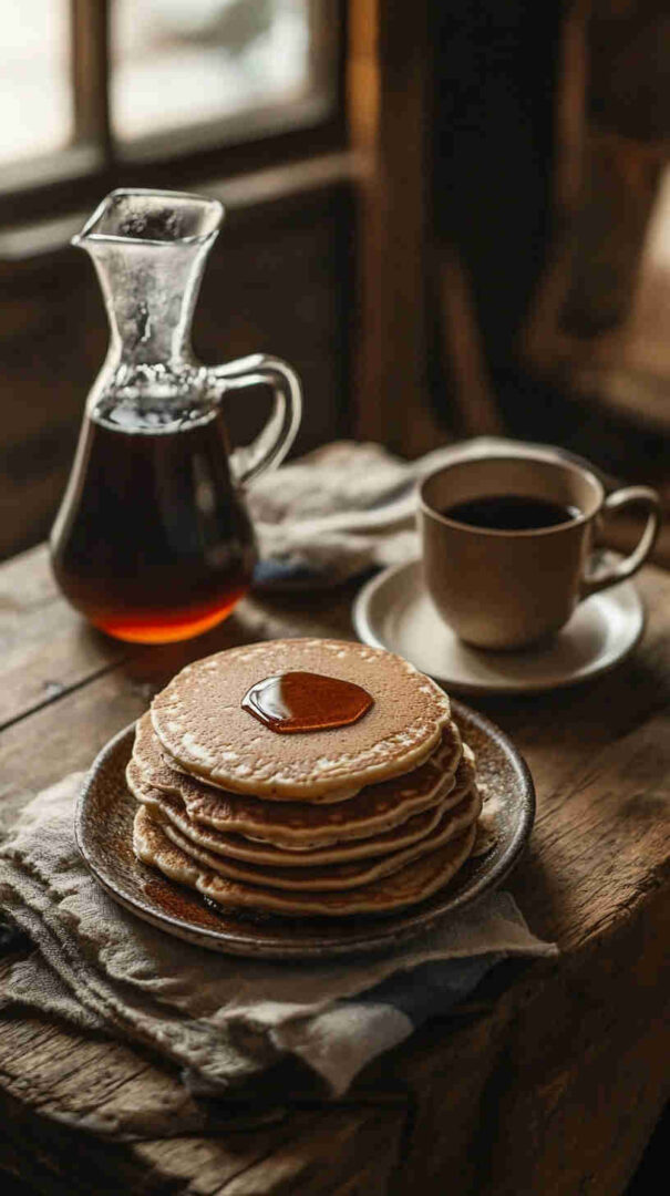 Salt sharpens flavors, vanilla adds warmth, and melted butter/oil brings richness. Pure maple syrup for serving is key—its deep, woody sweetness pairs perfectly with buckwheat’s robust profile.