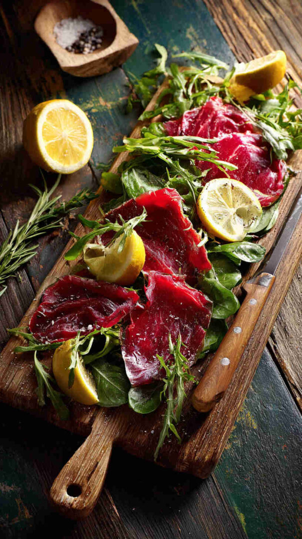 Thin raw beef slices with arugula, Parmesan, olive oil, lemon—classic elegant Italian starter!
