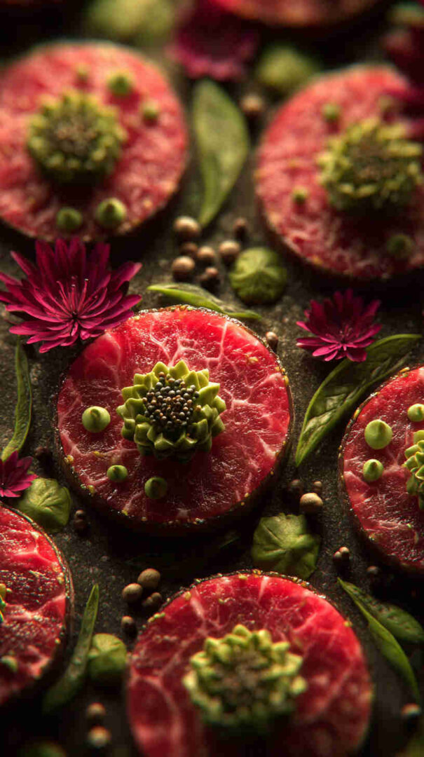Scatter capers and arugula in the center for height and contrast. Serve immediately—raw beef is best fresh. For food safety, use sushi-grade or very fresh, high-quality beef from a trusted source and consume promptly.