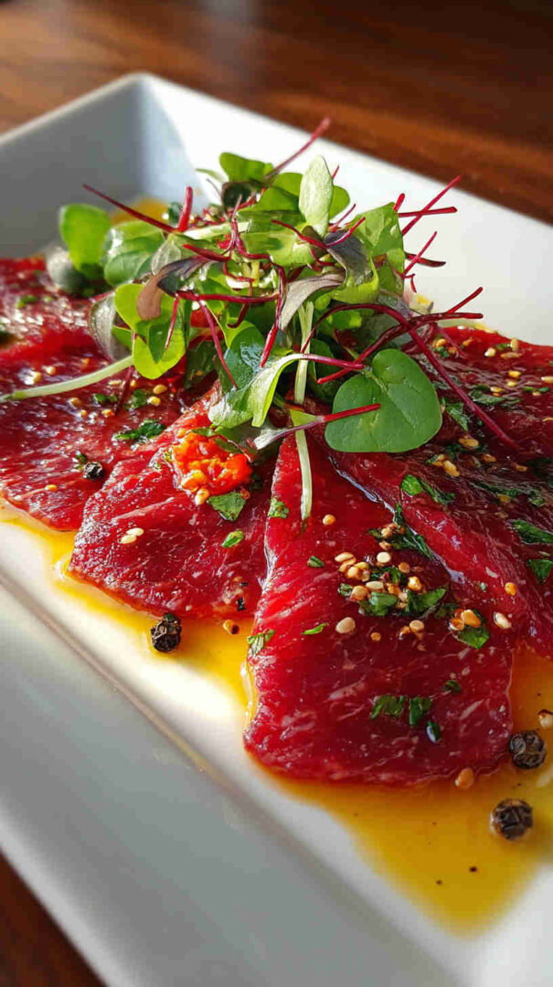 - Chill your plates — Pop serving plates in the fridge or freezer for 10 minutes—this keeps the carpaccio refreshingly cool and adds that pro touch.