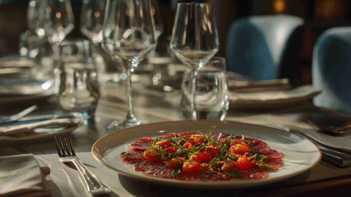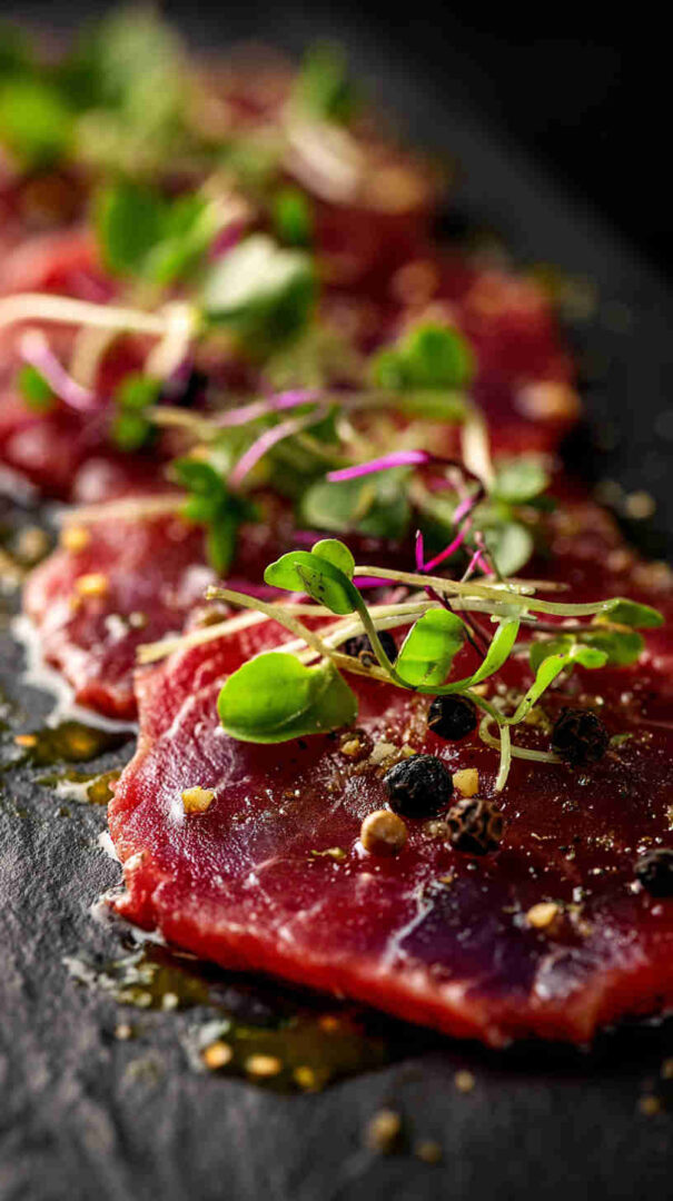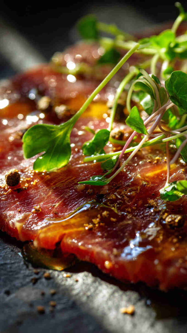 is an elegant Italian appetizer featuring paper-thin slices of raw, high-quality beef tenderloin, artfully arranged on a plate and dressed with a light drizzle of extra virgin olive oil, fresh lemon juice, flaky sea salt, and freshly cracked black pepper.