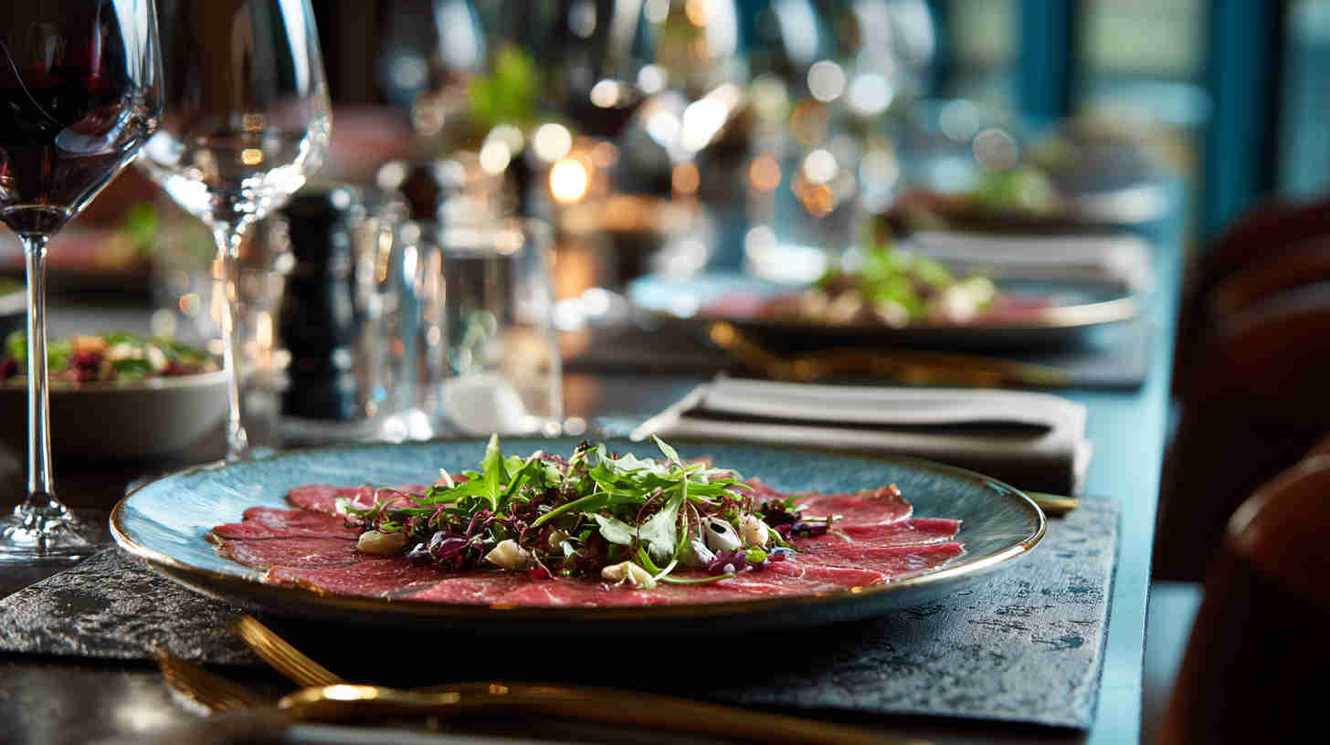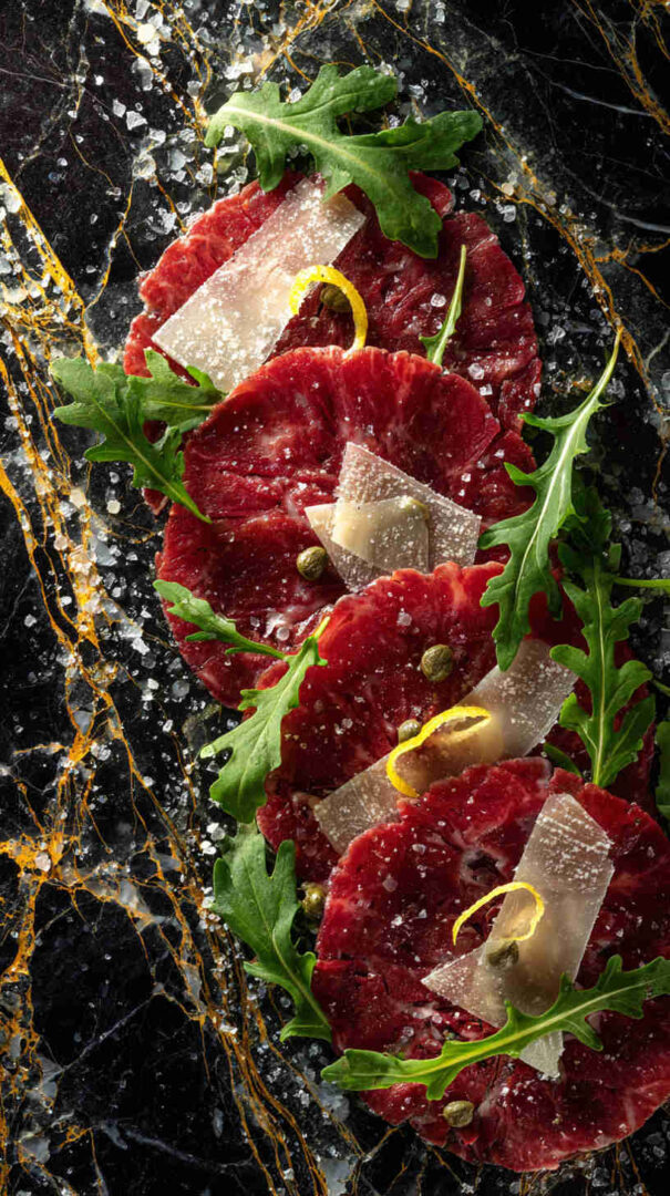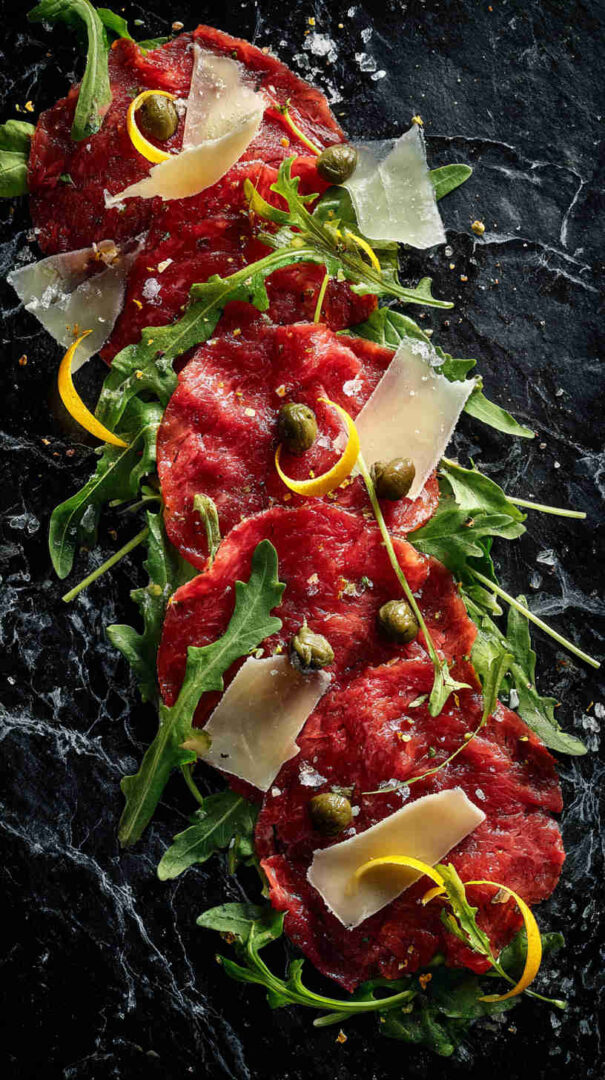 It’s topped with a mound of peppery arugula (rocket), generous shavings of Parmigiano-Reggiano cheese, and sometimes briny capers for extra zing—creating a refreshing, sophisticated dish that highlights the pure flavor of premium beef. (68 words—focused on classic essence)