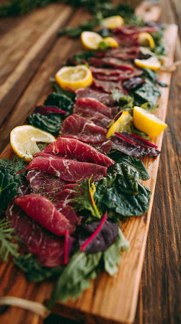 Chill plates in the fridge or freezer beforehand for a dramatic presentation and to keep everything refreshingly cool. Arrange beef in a single layer, slightly overlapping, for beauty. Drizzle oil and lemon just before serving to avoid “cooking” the meat or wilting greens. Use a vegetable peeler for perfect Parmesan shavings.