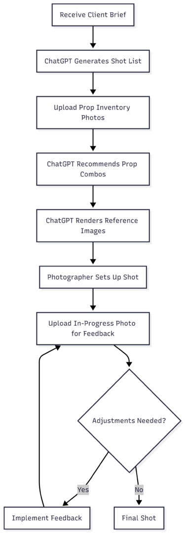 Rendering inspiration images: For GPT-4 users, you can ask ChatGPT to generate a rendered reference image showing your actual props arranged for the shot. This isn’t a finished photo — it’s closer to a rough sketch — but having a visual target significantly improves how efficiently you set up on shoot day.