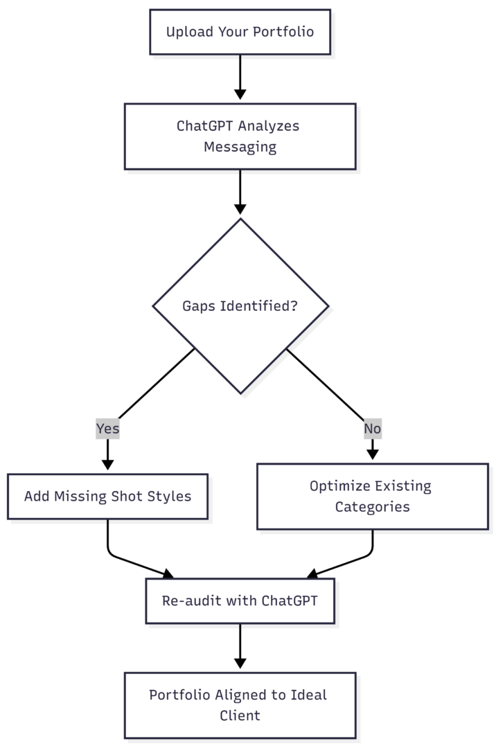 Upload your portfolio link (or paste in descriptions of your images) and ask: “What type of client does this portfolio attract? What brand categories does this work NOT speak to?” The analysis often reveals gaps you’ve been too close to see yourself — like having strong restaurant work but no packaged goods shots, making you invisible to CPG brands.