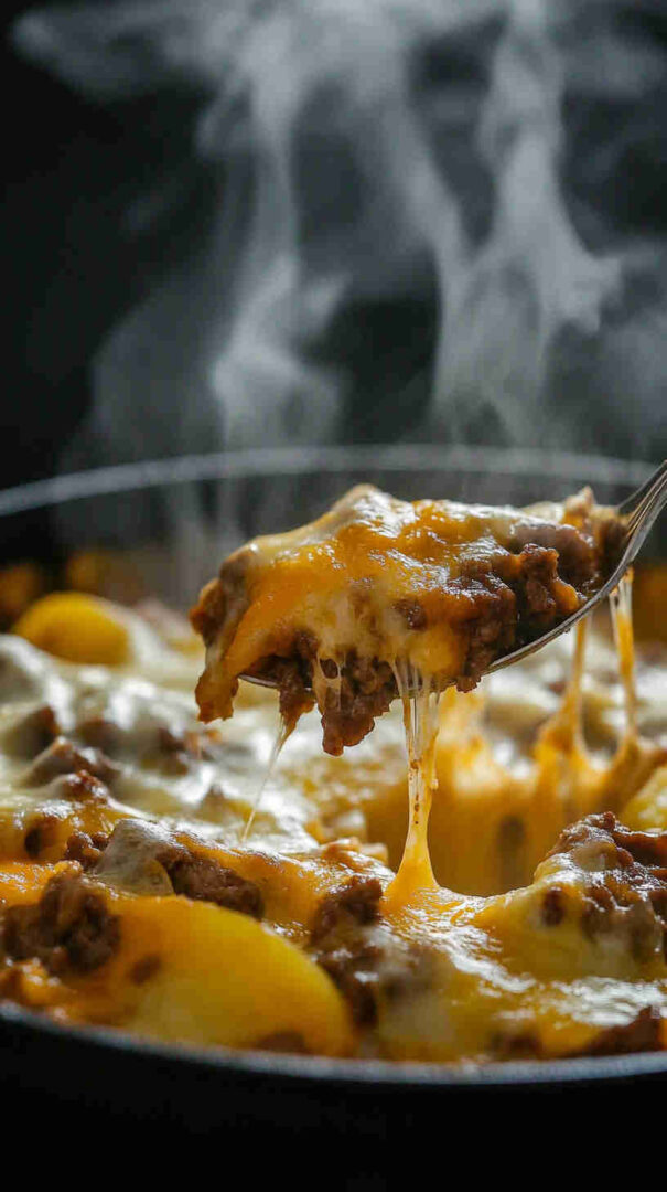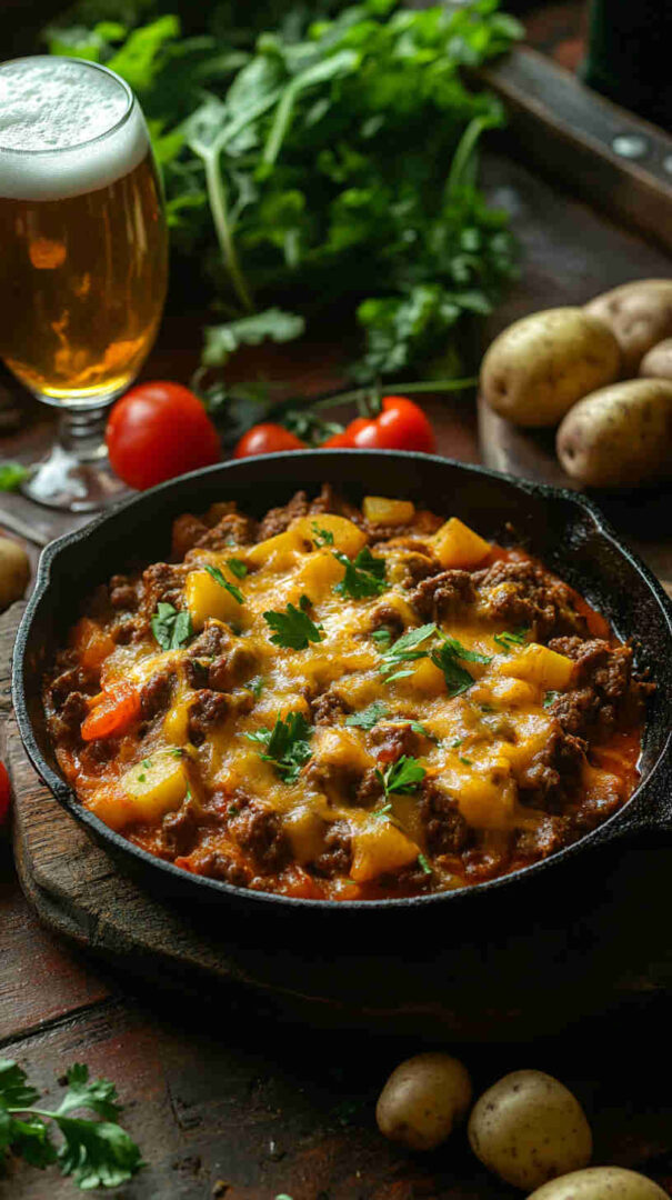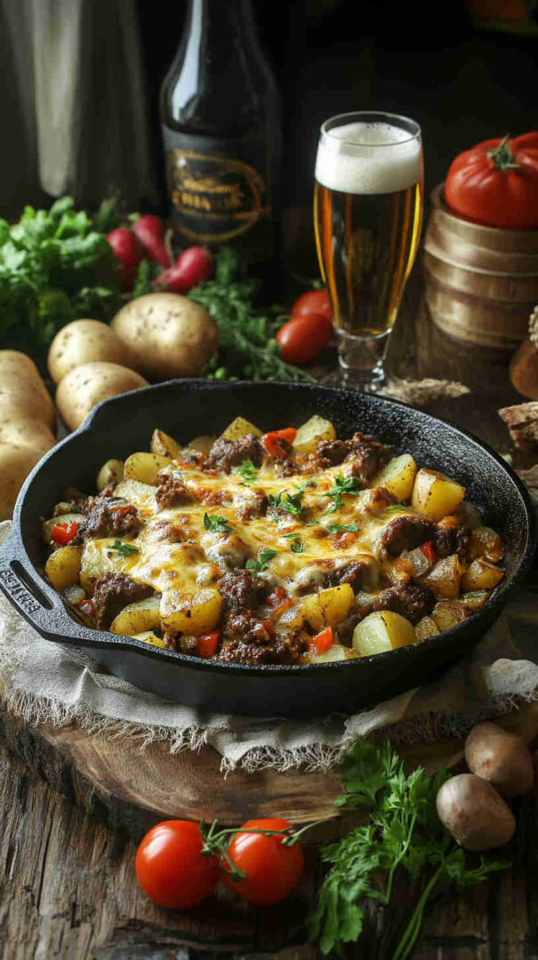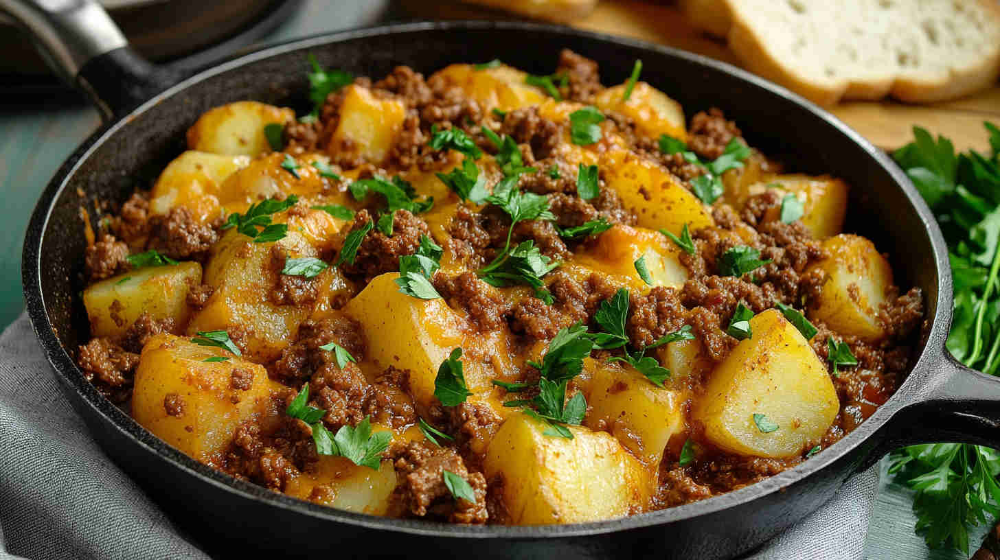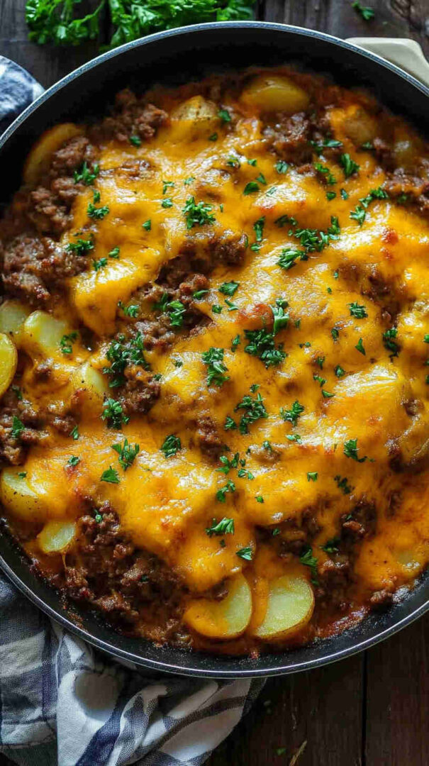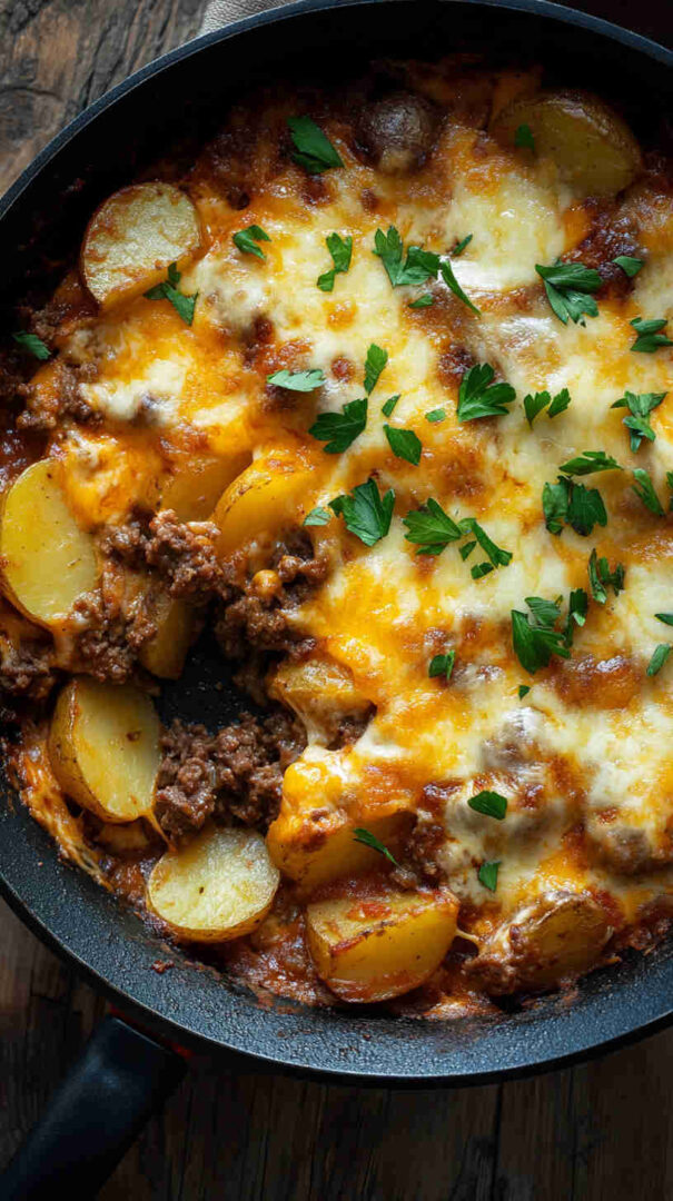 Golden-brown diced potatoes sautéed until crispy, mixed with savory seasoned ground beef, onions, garlic, and bell peppers, then smothered in gooey melted cheddar and mozzarella. Finished with a sprinkle of fresh herbs, this comforting skillet meal delivers crispy, cheesy, beefy goodness in every forkful—pure weeknight satisfaction.