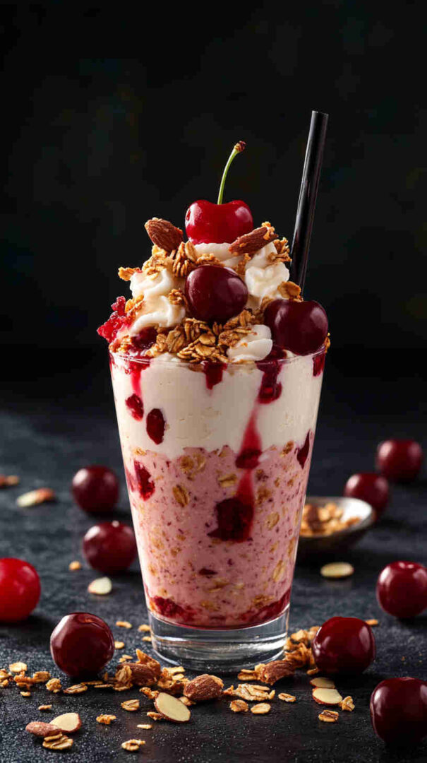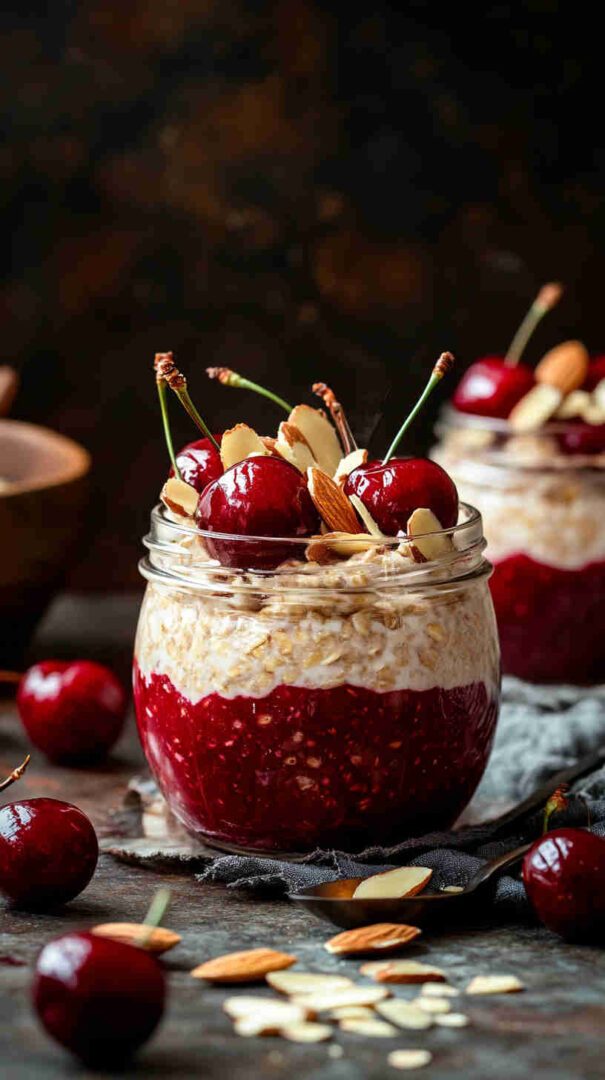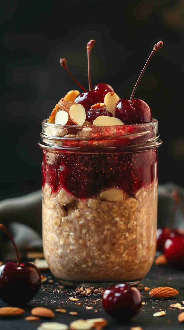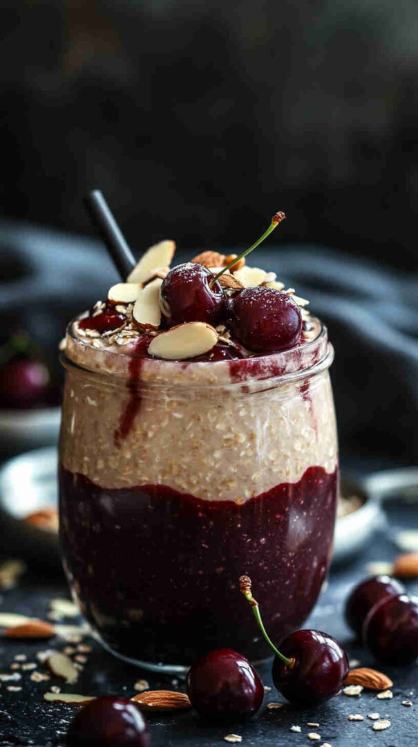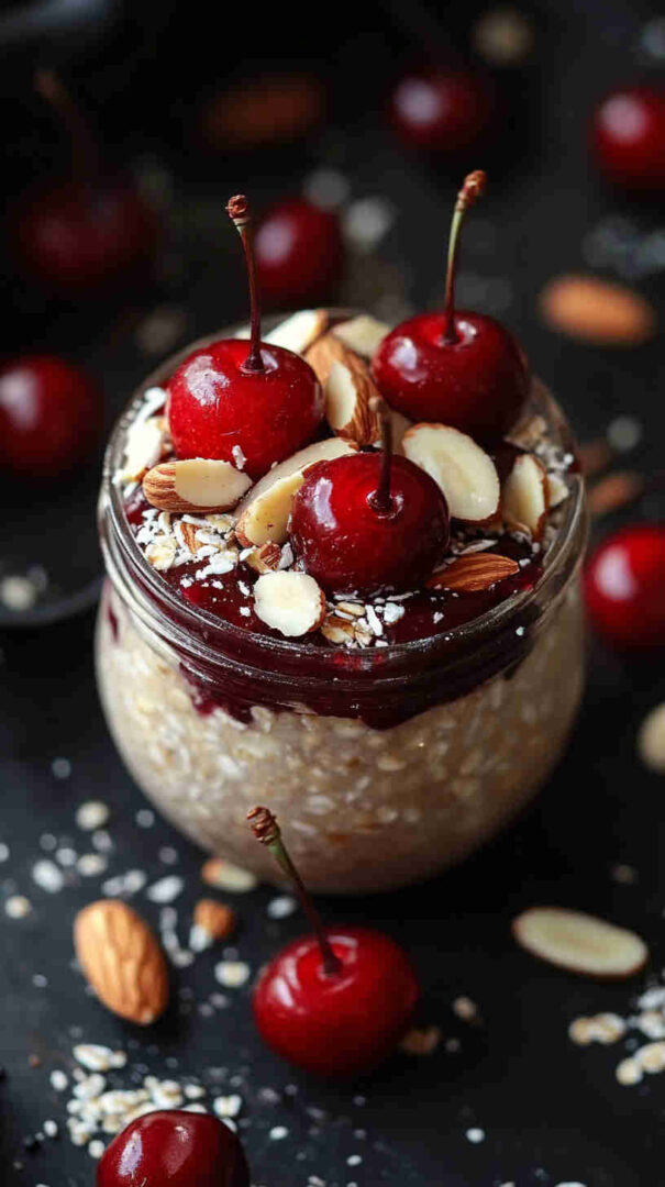 Creamy cherry almond overnight oats—juicy, protein-packed, no-cook breakfast with toasted crunch.