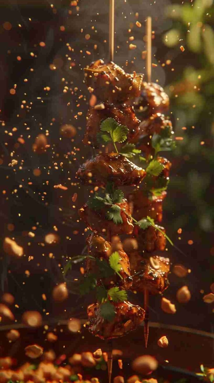 - Thread skewers: Weave chicken onto soaked sticks—pretty accordion style.