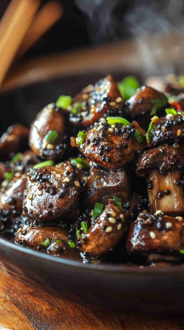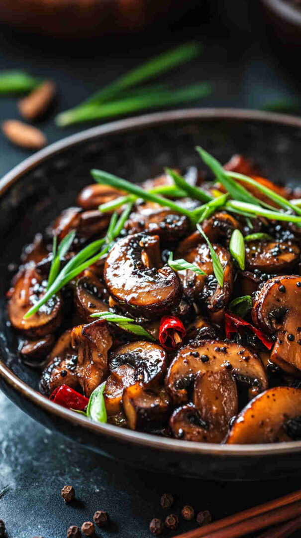 Quick Chinese stir-fried mushrooms in bold black pepper sauce — savory, peppery, umami-packed vegetarian delight.