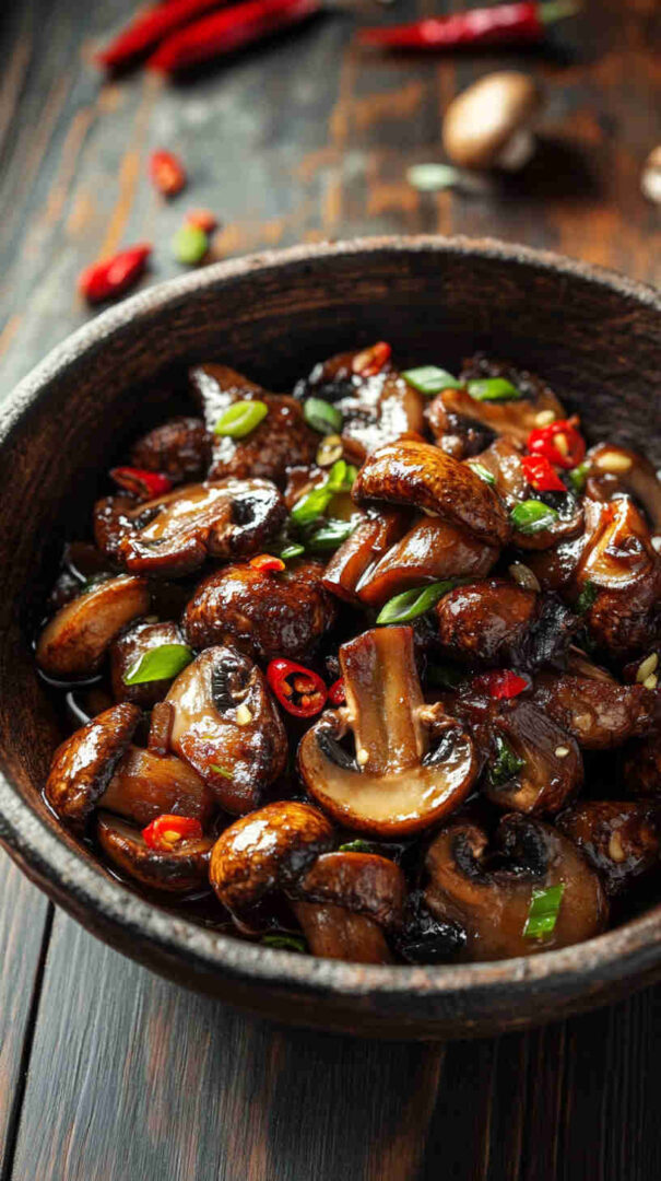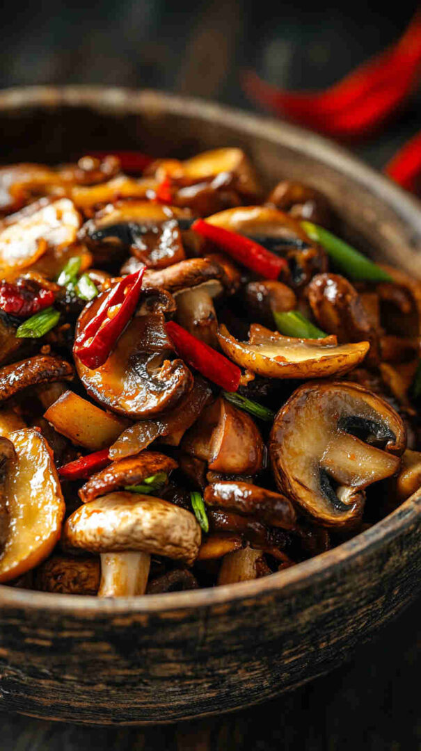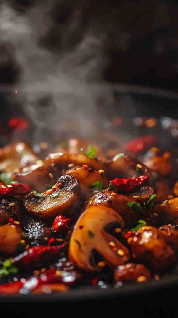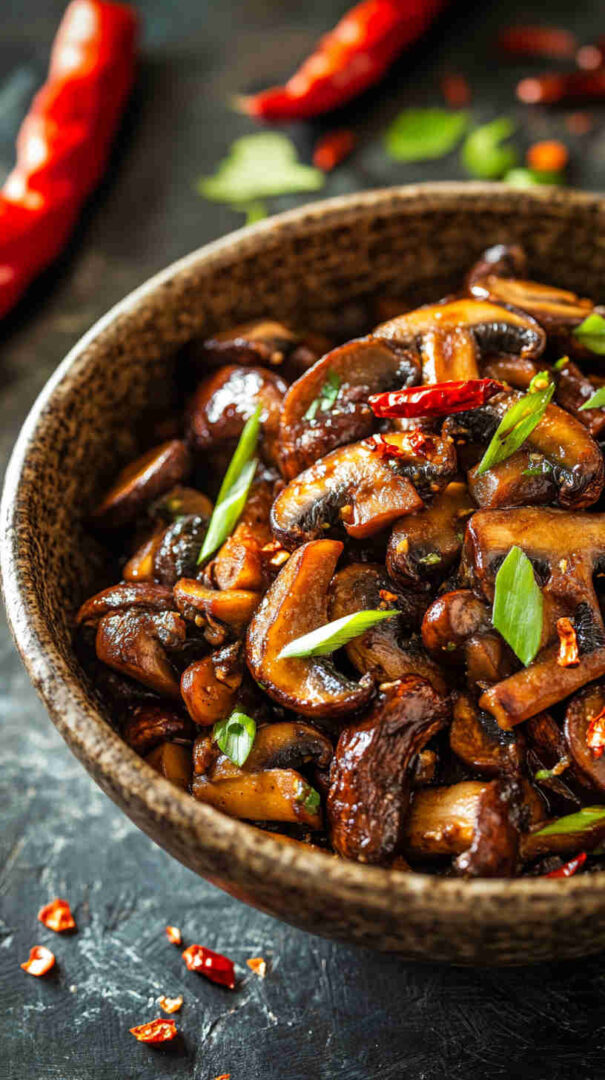 Fiery numbing Szechuan spicy mushrooms—bold Sichuan flavors in a glossy, addictive vegetarian sauce!