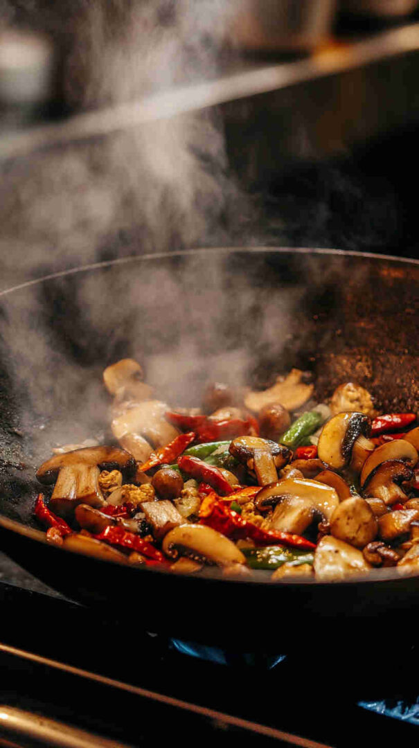 - Cook the mushrooms — Add all the prepared mushrooms to the wok. Stir-fry on high heat for 4–5 minutes until they release their moisture and start to soften and absorb the spicy aromas.
