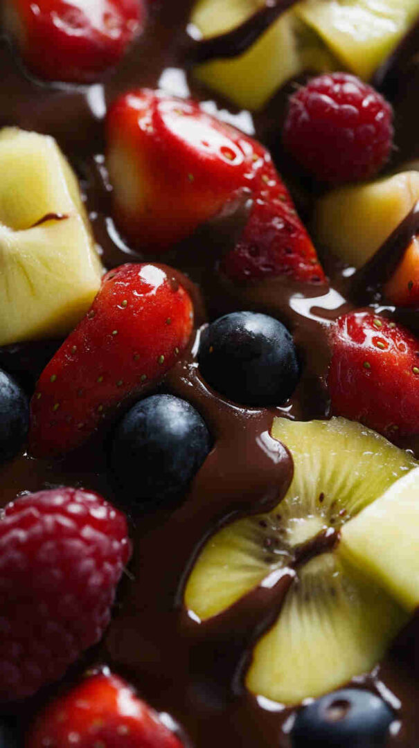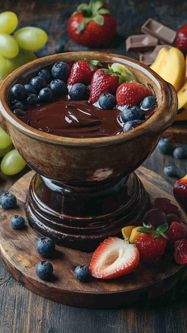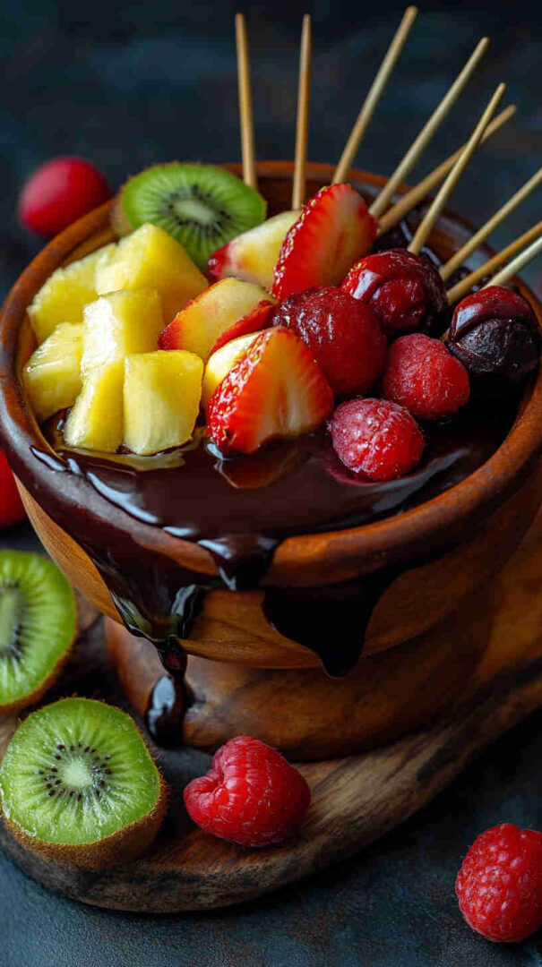 - Fresh fruit assortment — Strawberries, banana slices, pineapple chunks, apple slices, kiwi, grapes, raspberries, or orange segments work beautifully. Choose ripe, seasonal fruit for maximum natural sweetness and juiciness; the fruit provides fiber, vitamins, and a refreshing contrast to the rich chocolate.